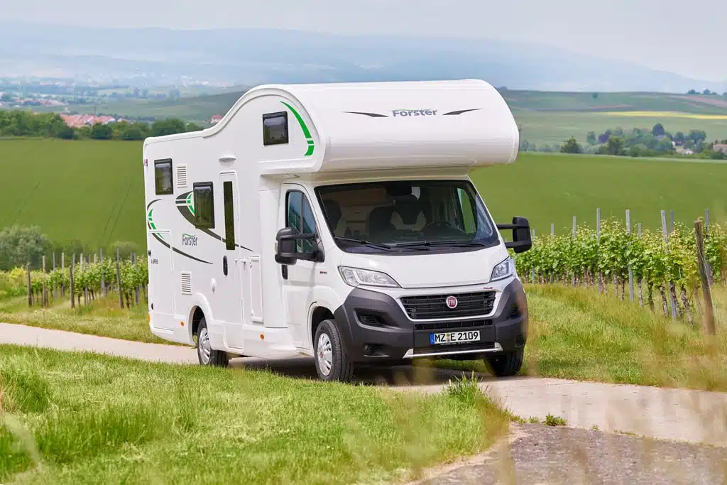 Geschwungene Linien in grün und anthrazit zieren die Außenwände der Fahrzeuge von Forster in der neuen Saison 2022. Zudem gestaltet die günstige Tochtermarke von Eura Mobil bei den Alkovenfahrzeugen, den Integrierten und den Teilintegrierten den Innenraum neu.