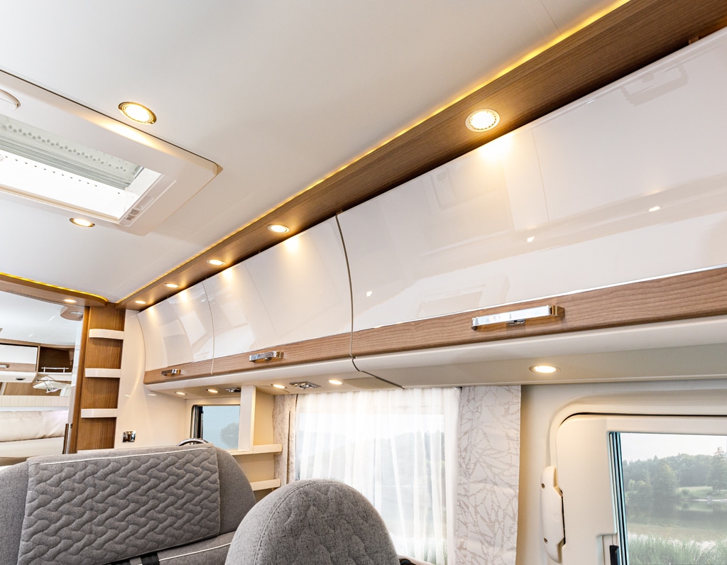 Die neue Möbelarchitektur mit konkaven, also nach innen gezogenen Klappen der Dachstauschränke sorgt für ein großzügiges Raumgefühl. Dazu gibt es neue Stilwelten in Bicolor-Optik. Die L-förmige Wohnsitzgruppe hat einen ausdrehbaren Schuhschrank in den Sitzbanksockel integriert. Ein neuer ausziehbarer Design-TV-Schrank rundet die gelungene Optik ab. Bei einigen Modellen ist sogar ein 32-Zoll-LED-Flachbildschirm möglich.