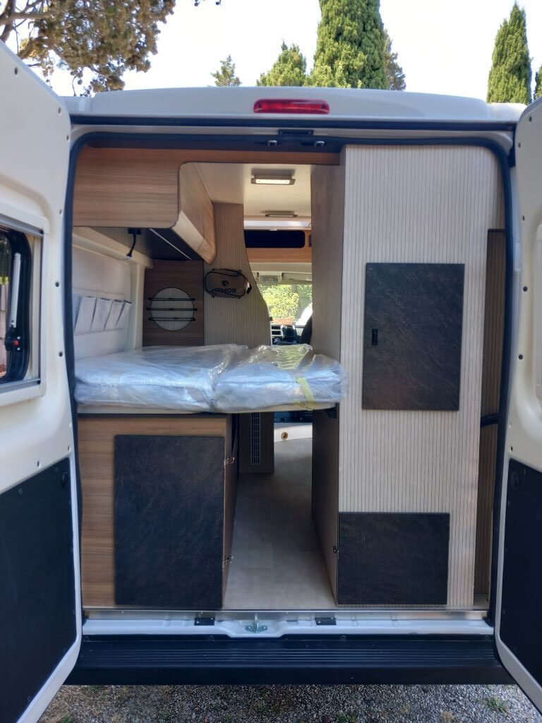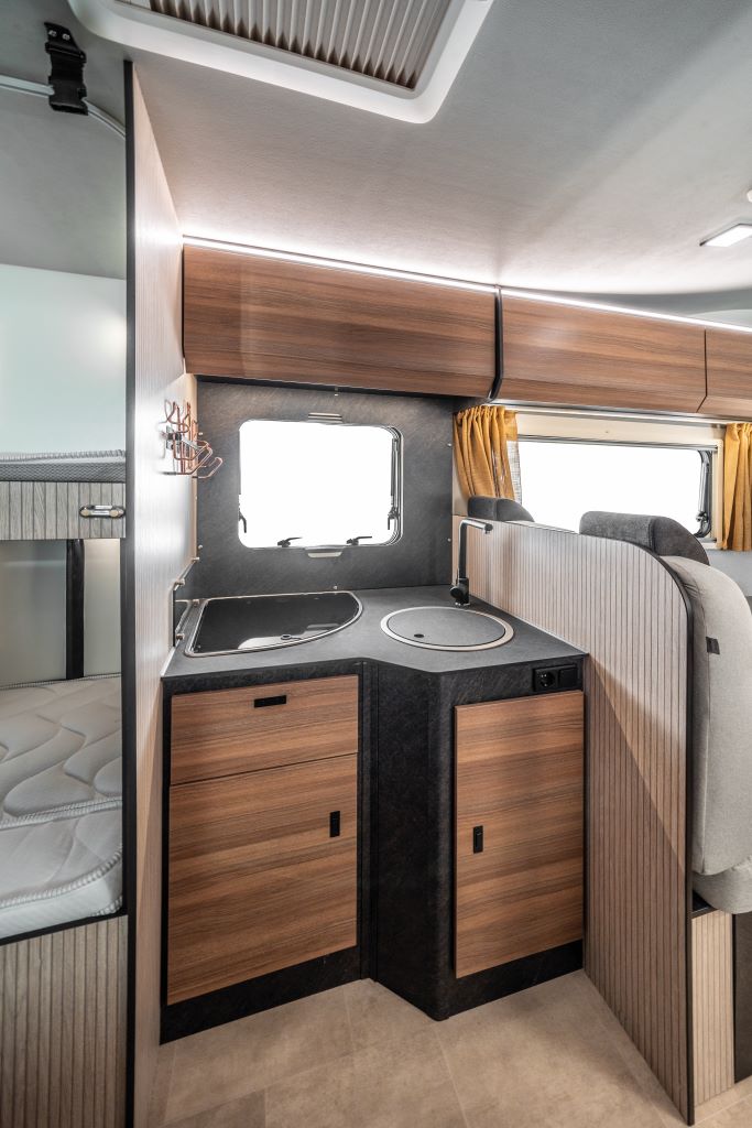 Doch mit der Baureihe Rimor Bliss erschöpft sich das Neuheiten-Portfolio der Italiener für 2025 nicht. Ebenfalls neu sind zwei kompakte Modelle der Kastenwagen-Baureihe Rimor Horus. Sie nutzen den kurzen 5,41-Meter-Fiat-Ducato als Basis. Während der Rimor Horus 54 auf einen klassenüblichen Grundriss mit Querbett im Heck setzt, kommt der Rimor Horus 12 mit einem französischen Längsbett und Bad daneben – im Kastenwagen, erst recht im kurzen 540er, eine Seltenheit.