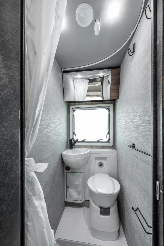 Den offenen Raumeindruck muss der Urlauber allerdings mit einem nur 1,10 Meter breiten und 1,89 Meter kurzen Bett bezahlen, das am Fußende – typisch Französischbett – noch schmaler wird. Es lässt sich in den Mittelgang verbreitern, doch dann ist kaum noch ein Durchkommen ins Bad – hier bleiben gerade einmal 20 Zentimeter. Der Rimor Horus 12 steht bereits ab 50.575 Euro in der Preisliste.