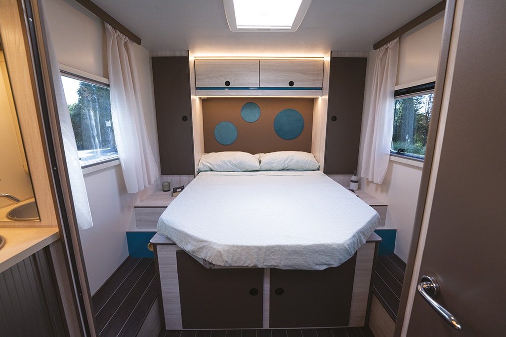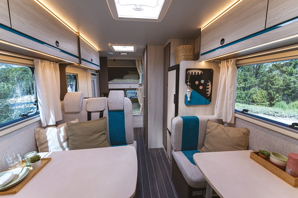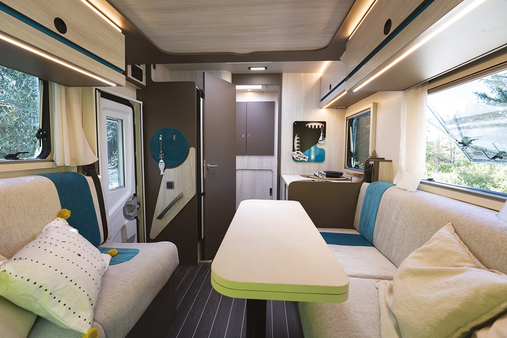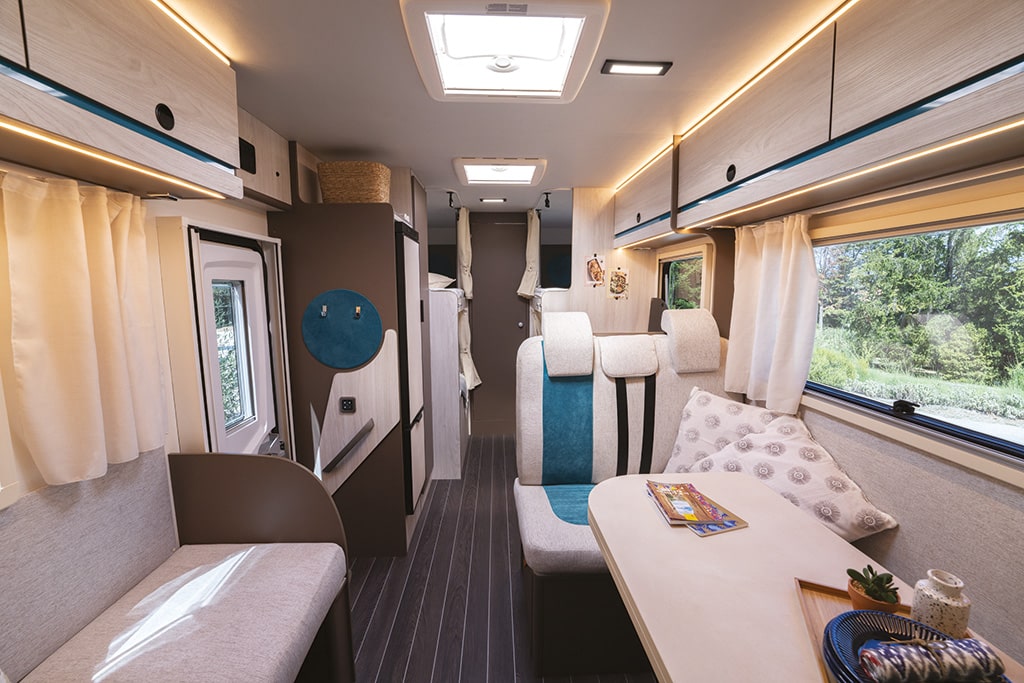 Die Vielfalt der Schlaflösungen bietet praktisch alle Konfigurationen: Einzelbetten, Etagenbetten, zentrales Bett, Querbett plus XXL-Klappbett vorne. Hinzu kommt ein dynamisch gestaltetes Exterieur, zum Beispiel mit einer neu konzipierten Haube der Teilintegrierten, die mit den Seitenflächen harmoniert, um die aerodynamische Effizienz zu optimieren.