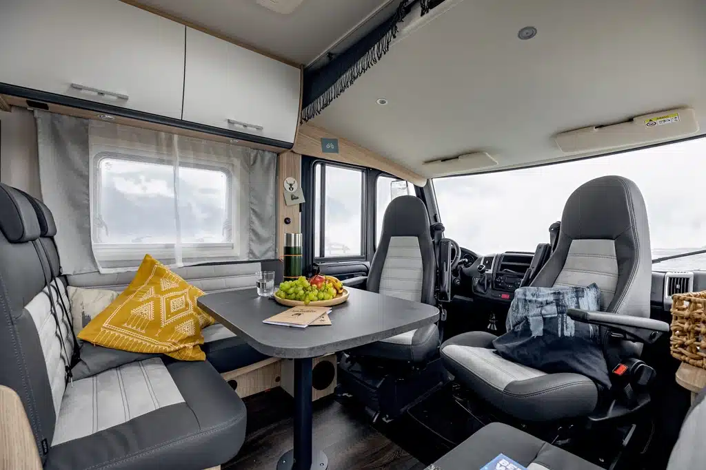 Kurze Alkovenmobile sind im Kommen – überzeugen sie doch durch ihre kompakten Fahrzeugmaße und nutzen dabei den begrenzten Platz mit vier festen Schlafmöglichkeiten optimal aus. Diesem Trend folgend, bringt Sunlight mit dem A 60 seinen ersten Alkoven unter sechs Metern Länge auf den Markt. Erstmals lassen sich hier die Fahrersitze drehen und zu einer Sitzgruppe mit Halbdinette formen. Ebenfalls neu ist die Möglichkeit, das Alkovenbett zur Hälfte hochzuklappen. So lässt sich mehr Kopffreiheit über der Sitzgruppe und vor allem über den gedrehten Fahrersitzen gewinnen. Diese Klapp-Funktion findet sich in allen Alkoven-Modellen von Sunlight.