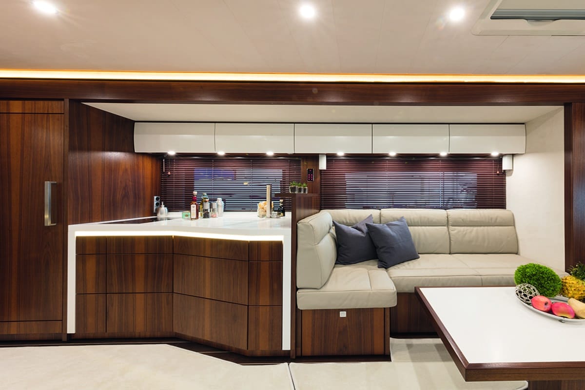 Das Interieur in Bentart-Design kontrastiert Satin-Weiß mit Edelholzfurnier vom amerikanischen Nussbaum, gefertigt von Hand. Diese Ausstattungslinie setzt sich durch sanft gerundete Formen markant zum modern geradlinigen Design ab. Sie setzt die helle kubische Leder-Lounge in Szene. Das Ambiente des Reisemobil-Salons mit seinem XXL-Silde-out erfüllt das Bose-Home-Entertainment-System mit Musik im Spitzenklang. Mikroprozessorgesteuerte Beleuchtungsmodule erzeugen mit Memory-Lichtszenen und Dimmfunktionen eine stimmungsvolle Beleuchtung. Sogar in den Griffnischen der Türen und Auszüge geben LED-Spots sanftes Licht ab.