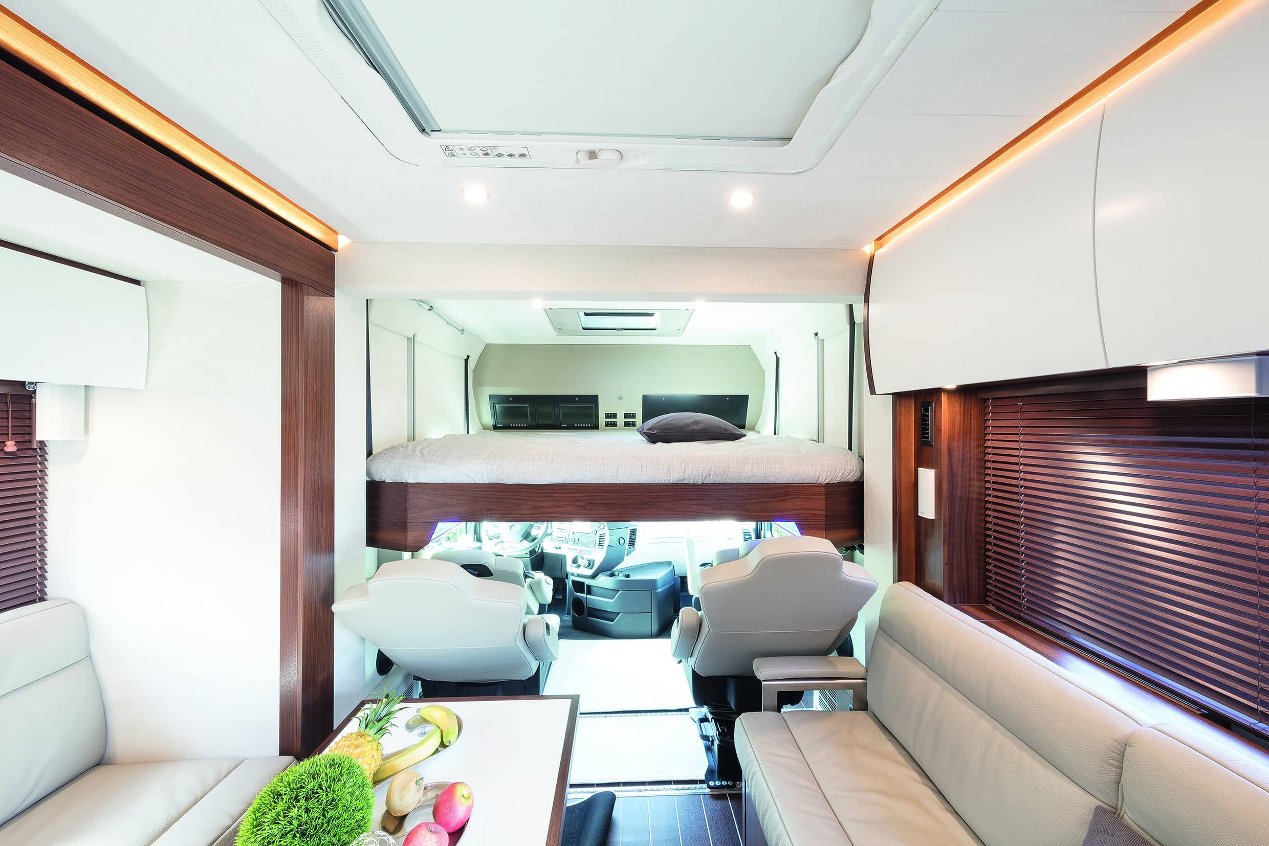 Auf dem Chassis sitzt der Aufbau mit pneumatisch dichtendem Wohnraumerker. Dazu gehören ein Pull-down-Bett über dem Fahrerhaus bei voller Stehhöhe sowie ein 360-Grad-Rundumsicht-System. Im Heck schluckt die große Pkw-Garage ein Cabrio und E-Bikes.