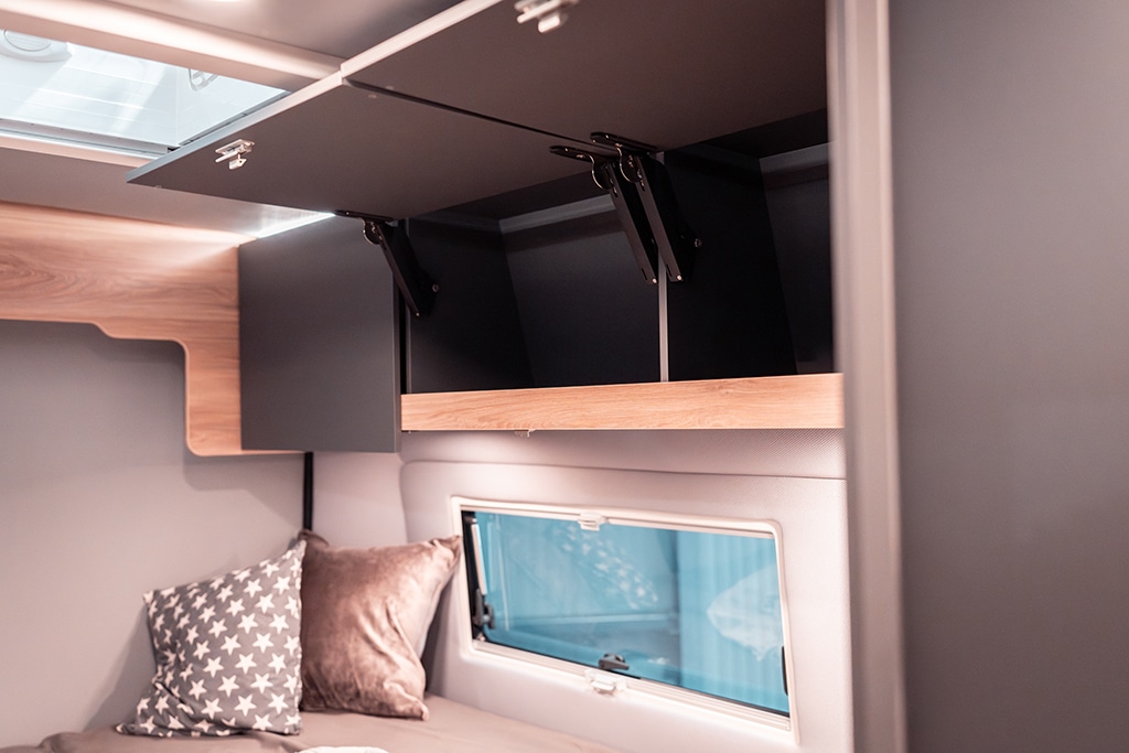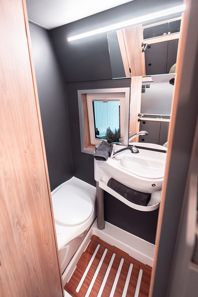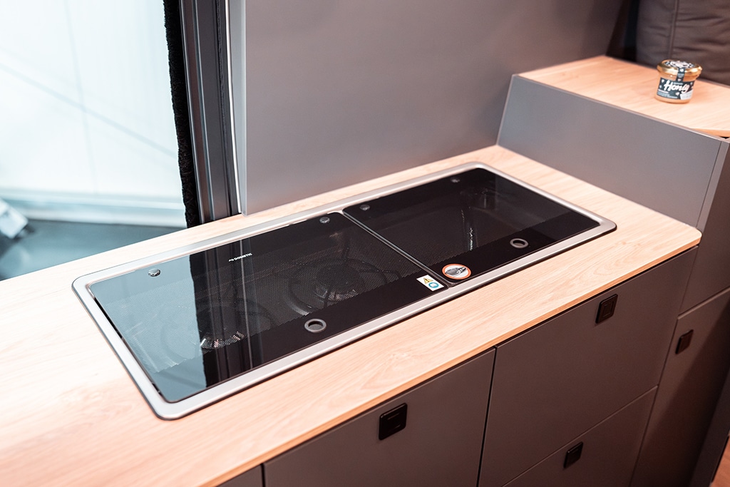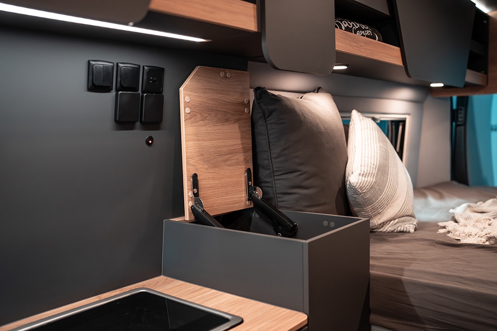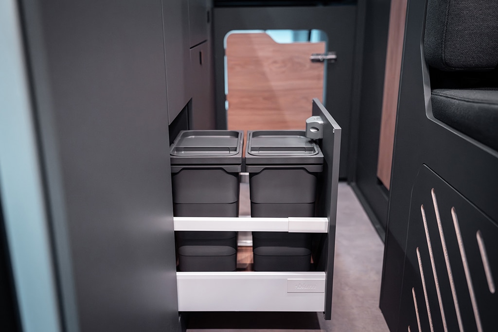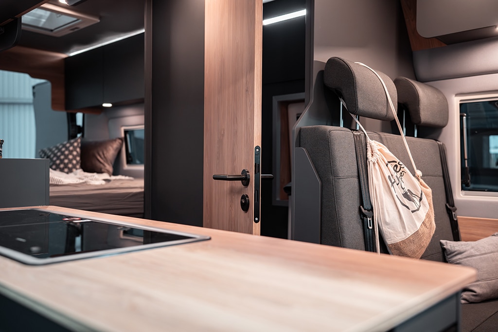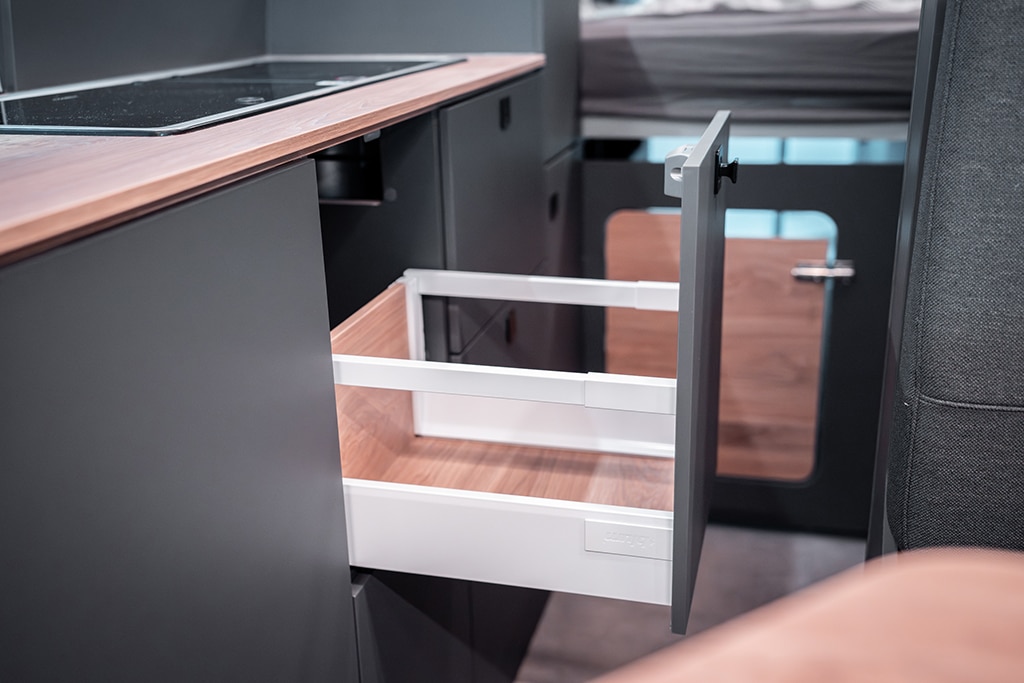 Die VIICA VANS begeistern insbesondere durch ein atemberaubendes und modernes Interieur Design. Dunkle Fronten harmonieren mit Oberflächen in Holzoptik und werden durch hochwertige Elemente wie z.B. Drückergarnituren an der der Badtür mit innenliegendem Scharnier ergänzt. Aber auch zahlreiche praktische Aspekte wurden mit viel Liebe fürs Detail berücksichtigt. So verfügt der VIICA VAN beispielsweise serienmäßig über praktische Schubladensysteme mit Mülltrennsystem im Küchenbereich, einen Schwerlastauszug für Gasflaschen im Heck des Campers, eine Außendusche und einen Kühlschrank mit Doppelscharnier.