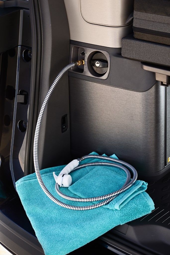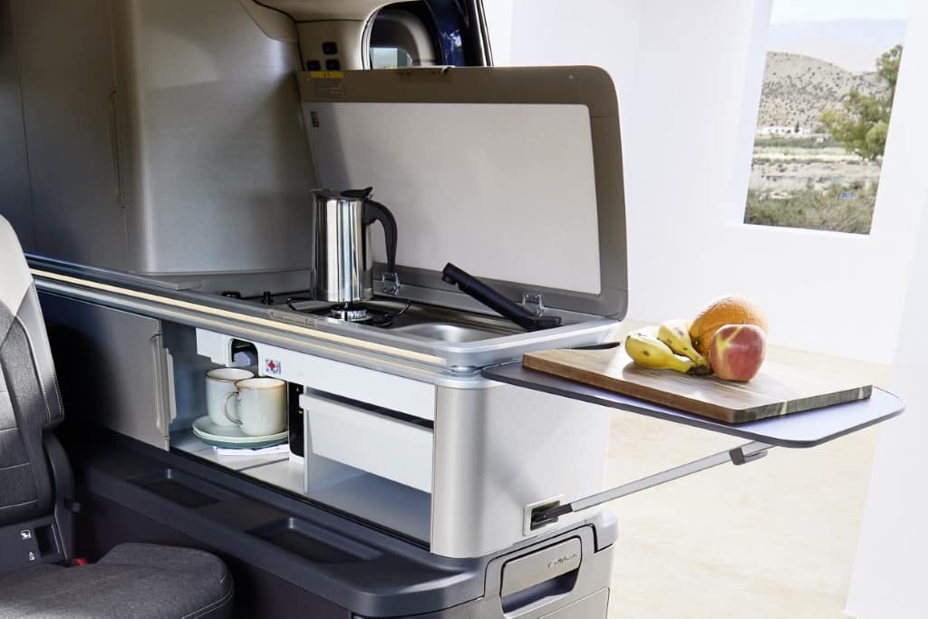 Die größten Änderungen gegenüber dem California Concept betreffen den kompakten Küchenblock. Zwar bleibt die Idee die selbe – die zweite Schiebetür bleibt auf 50 Zentimetern passierbar – doch während im Showcar noch ein Elektrogrill, ein Induktionskocher und ein Gaskochfeld auf einer verschiebbaren Arbeitsfläche angedacht waren, setzt das Serienfahrzeug ausschließlich auf Gas. Obwohl auch ein 40 Ah großer Lithium-Akku serienmäßig verbaut ist. Auch im Vergleich zum Vorgänger auf T6.1 muss man Abstriche machen, denn der Kocher besitzt nur noch eine Flamme und es gibt weniger große Staufächer. Genauer gesagt, sind es zwei kleine und eine Besteckschublade.