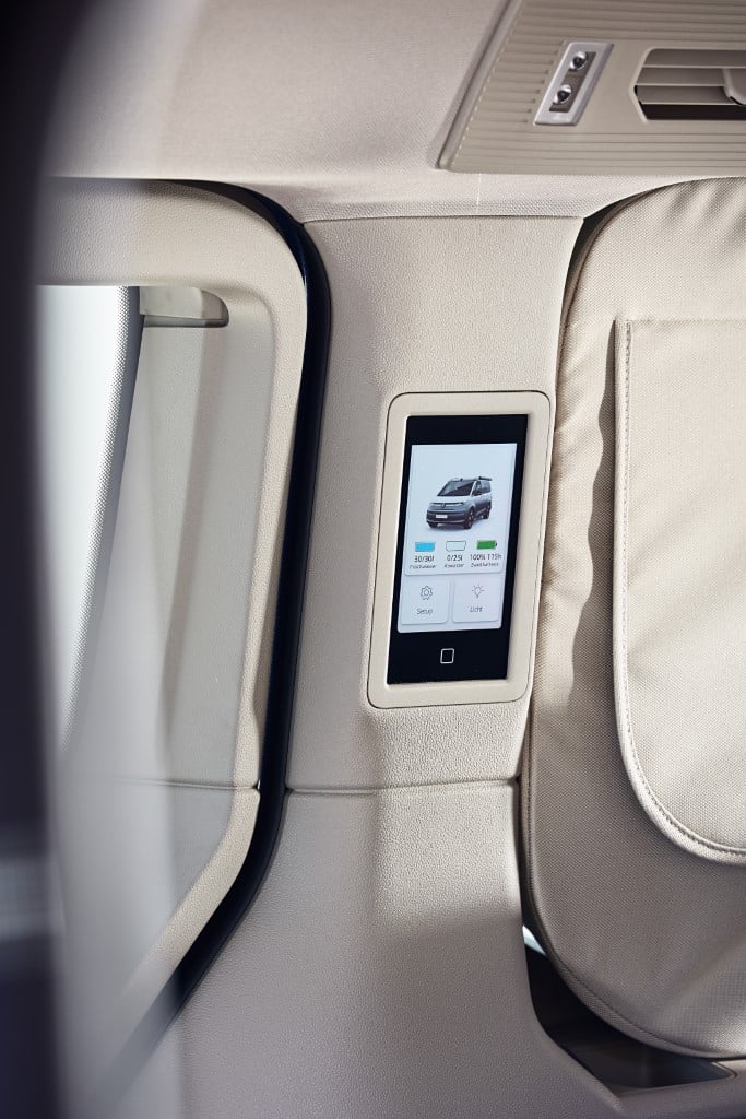 Das wird weiterhin aber auch per App möglich sein und am Touchdisplay im Wohnraum, das in der Serie deutlich kleiner geworden ist (5 Zoll) und nun an der beifahrerseitigen B-Säule unterkommt. Allerdings: In der Serie wird das Aufstelldach künftig wieder manuell betätigt. Eine rein mechanische Version war in der Vergangenheit wohl oftmals vom Kunden gewünscht worden. Technisch bietet das Aufstelldach ein Bettgestell mit Federtellersystem und einer 208 mal 113 Zentimeter großen, vier Zentimeter starken Matratze. Das sind druchaus ein paar Zentimeter mehr als im California auf T6.1. Der Zeltbalg ähnelt dem des California 6.1 und lässt sich großzügiger öffnen als noch beim Showcar.