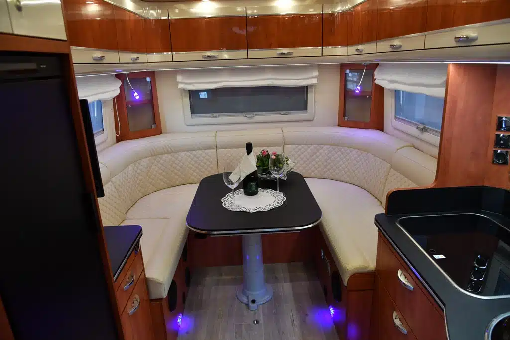 Die im Stile edler Sportwagen gepolsterte Hecksitzgruppe lädt zu gemütlichen Runden ein, Küche und auch das Raumbad mit separater Dusche sind groß genug, um sich wohlzufühlen. Der Silverdream 690 RS ist – wie von der Marke gewohnt – sehr gut ausgestattet. Mit dem neuen Zwei-Liter-Turbodiesel-Motor und 170 PS kostet das crashsichere Monocoque-Mobil 127.900 Euro. Die isolierten Frisch- und Abwassertanks fassen je 150 Liter. Damit ist der Silverdream auch für den Winterbetrieb gerüstet.