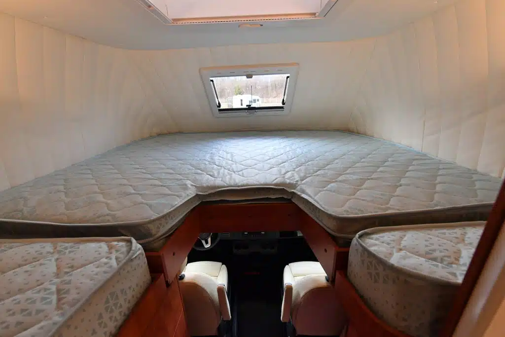 Aus dem Schrank hinter dem Fahrersitz lässt sich ein großer Block mit angenehm tiefen Stufen herausziehen, um hoch ins Bett zu steigen. Ein weiterer Trick für mehr Freiraum beim Aufstieg: Ein mittig montiertes, großes Heki schafft über der Treppe Kopfund damit Bewegungsfreiheit.