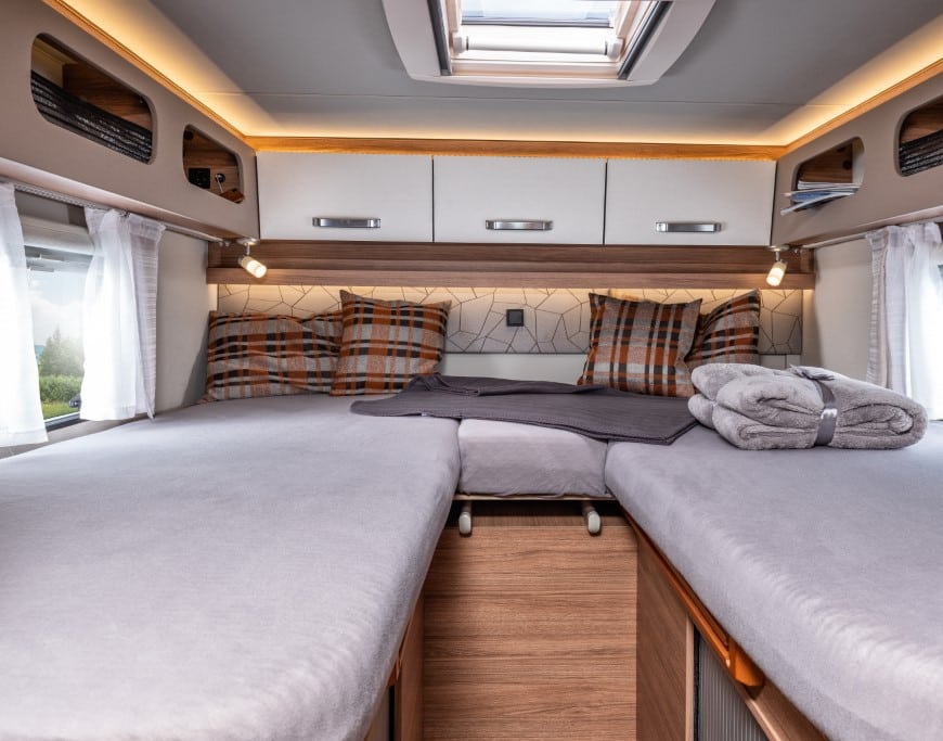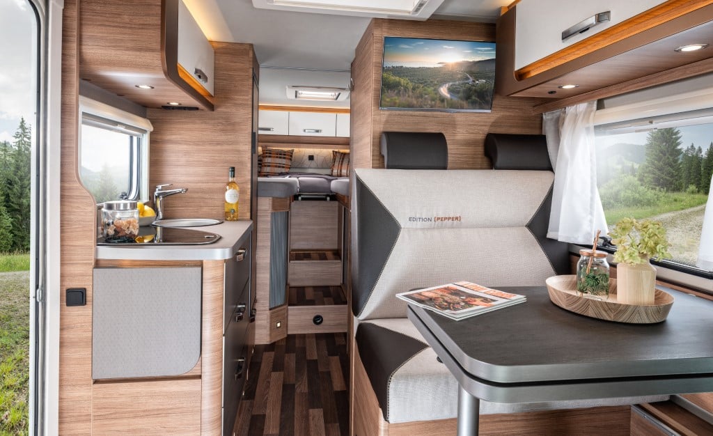Gänzlich neu neben der Basis ist hingegen eine Version mit zusätzlichem Hubbett über der Sitzgruppe, die auf den Namen CaraCompact Suite hört und ebenfalls als Pepper verfügbar sein wird. Die übrige Einrichtung im knapp sieben Meter langen 640 MEG folgt dem bekannten Layout mit Einzelbetten über der Heckgarage, einem Küchenblock auf der Beifahrerseite, gegenüberliegendem Bad und einer Halbdinette mit drehbaren Fahrerhaussitzen im Bug des 2,20 Meter schmalen Vans.