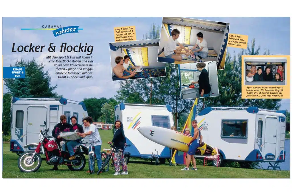Die letzten 30 Jahre waren geprägt vom Wandel – dem Wandel, einer Leichtbau-Wohnkiste auf zwei Rädern ein anderes Image zu verleihen. Der Siegeszug der Womos war unaufhaltsam, und ein wenig Imagetransfer sollte dem Caravan guttun. Also machten sich die Hersteller dran, Modelle zu entwerfen, die dem Caravaning ein neues Image verpassten – ohne natürlich die Serienproduktion zu vernachlässigen, denn hier wurde das Geld verdient. Mit dem Umzug der internationalen Leitmesse Caravan Salon von Essen nach Düsseldorf war ein weiterer Image-Schritt vollzogen und der erste große Wurf wurde 1995 aufs Papier gebracht, der Sport&Fun von Knaus.