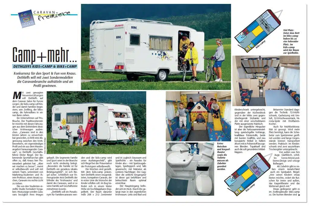 Es ging aber auch anders. Noch im selben Jahr brachte Dethleffs den Kids & Camp und den Bike & Camp. Mit den beiden gewagten Neuentwicklungen sorgte Dethleffs auf dem Caravan Salon 1996 für Furore: Der Kids & Camp sollte Kinder und damit Familien begeistern; sein Zwilling, der Bike & Camp, die Fahrradfans in seinen Bann ziehen. Der Traditionshersteller wollte aus dem Einheitsbrei deutscher Wohnwagen ausbrechen.