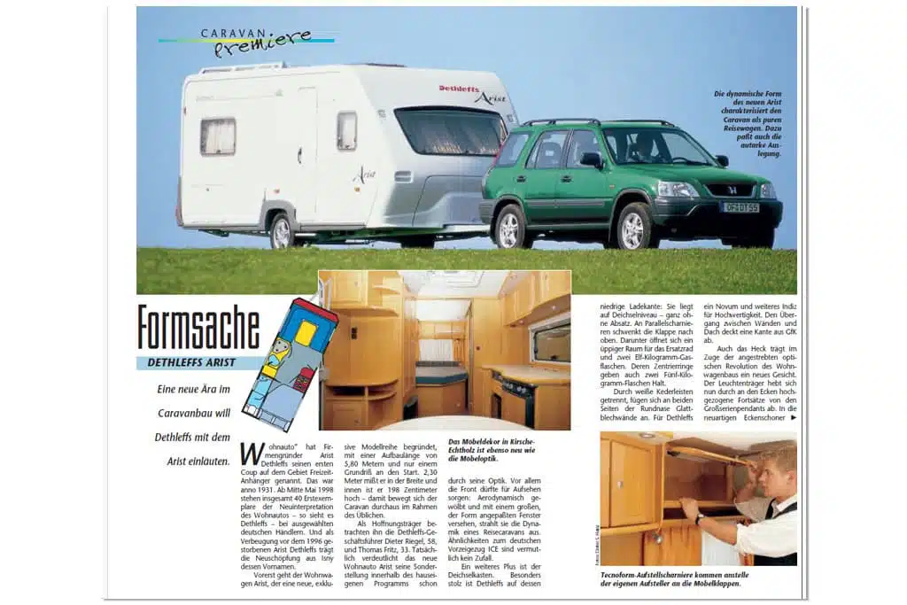 Auch Dethleffs wollte eine neue Ära im Caravanbau einläuten. Als Verbeugung vor dem 1996 verstorbenen Arist Dethleffs trug die Neuschöpfung 1998 dessen Vornamen Arist. Er sollte eine exklusive Modellreihe begründen, ging mit 5,80 Metern und nur einem Grundriss an den Start. Die Dethleffs-Geschäftsführer Riegel und Fritz betrachteten den Arist als Hoffnungsträger. Besonders die aerodynamisch gewölbte Front mit einem großen, angepassten Fenster fiel auf. Glattblech stellte für Dethleffs ein Novum und Hochwertigkeit dar.