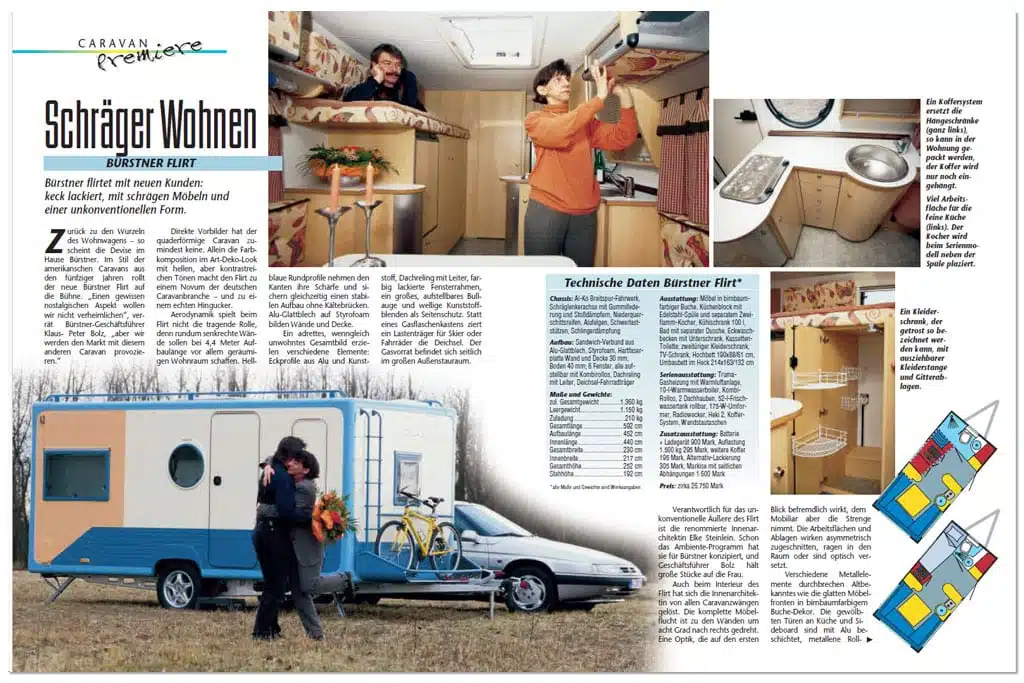 Das forderte die Branche heraus. 1997 brachte Bürstner den Flirt – eine Kiste auf Rädern im wahrsten Sinne des Wortes. Direkte Vorbilder hatte der quaderförmige Flirt 1997 keine. Allein die Farbkomposition im Art-Deko-Look mit hellen, aber kontrastreichen Tönen machten den Flirt zu einem Novum der deutschen Caravanbranche – und zu einem echten Hingucker.