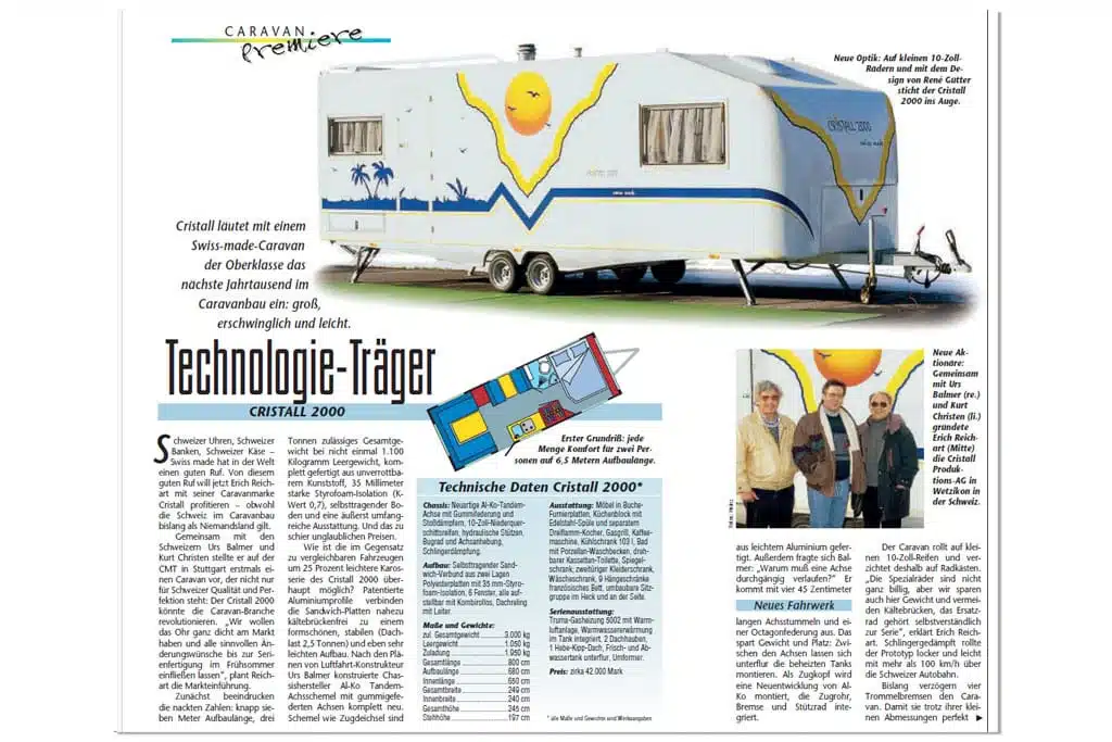 Swiss made hatte 1998 einen guten Ruf. Von diesem Ruf wollte Erich Reichart mit der Caravanmarke Cristall profitieren. Gemeinsam mit den Schweizern Urs Balmer und Kurt Christen stellte er auf der CMT in Stuttgart erstmals einen Caravan vor, der für Schweizer Qualität und Perfektion stand: Der Cristall 2000 sollte die Caravan-Branche revolutionieren.
