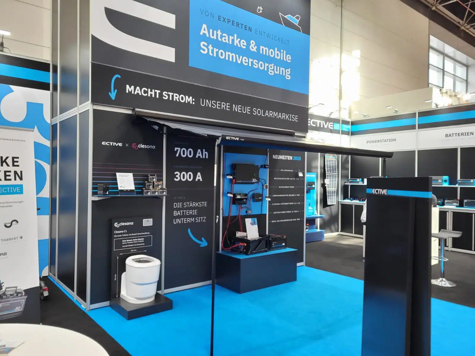 Mit der neuen Solarmarkise nutzt Ective ungenutzte Flächen als Energiequelle. Ausgefahren liefern die integrierten Dünnschicht-Solarzellen (CIGS) bis zu 4,5 kWh Strom am Tag. Sie gelten als besonders effizient bei wechselnden Lichtverhältnissen und hohen Temperaturen. Dank rollbarer Module mit über 17 Prozent Umwandlungsrate bleibt die Markise flexibel, ein leiser Elektromotor sorgt für komfortables Handling. Neben der Innovation präsentiert Ective auch sein Sortiment an Wechselrichtern, LiFePO4- und Natriumbatterien sowie passendes Zubehör. www.ective.de