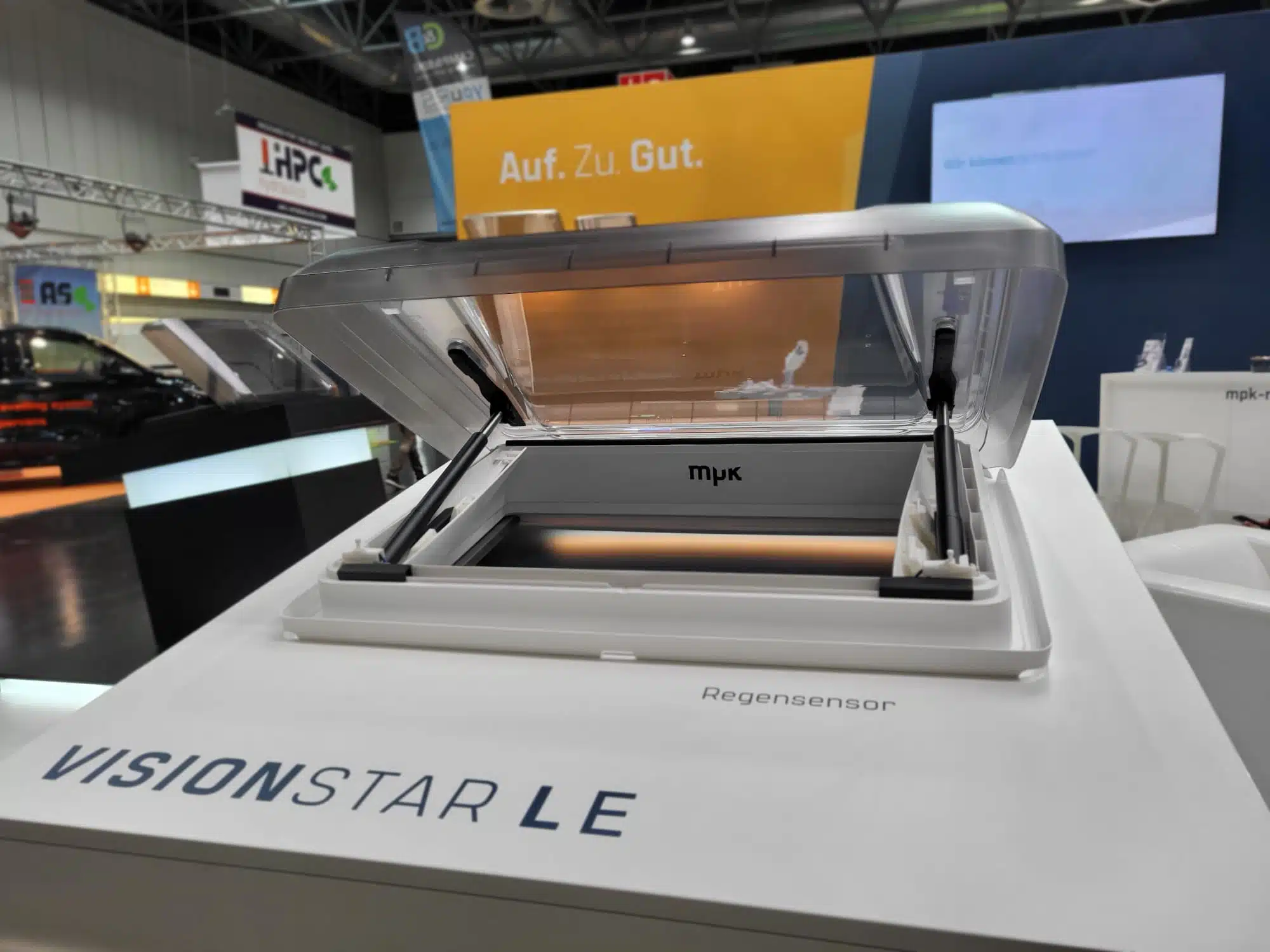 Die Firma MPK bringt gleich zwei Neuheiten zum Caravan Salon nach Düsseldorf. Mit der VisionStar LE feiert erstmals eine elektrische Dachhaube Serienpremiere: Per Fernbedienung lässt sie sich stufenlos bis zu 60 Grad öffnen, leise und in wenigen Sekunden. Ein optionaler Regensensor sorgt dafür, dass sich die Haube automatisch schließt, sobald die ersten Tropfen fallen. Außerdem arbeitet MPK bereits an einer Lösung, wie sich die Dachhaube in das smarte Bordnetz moderner Reisemobile einbinden lässt. Markteinführung ist für Frühjahr 2026 geplant, der voraussichtliche Preis: rund 900 Euro.