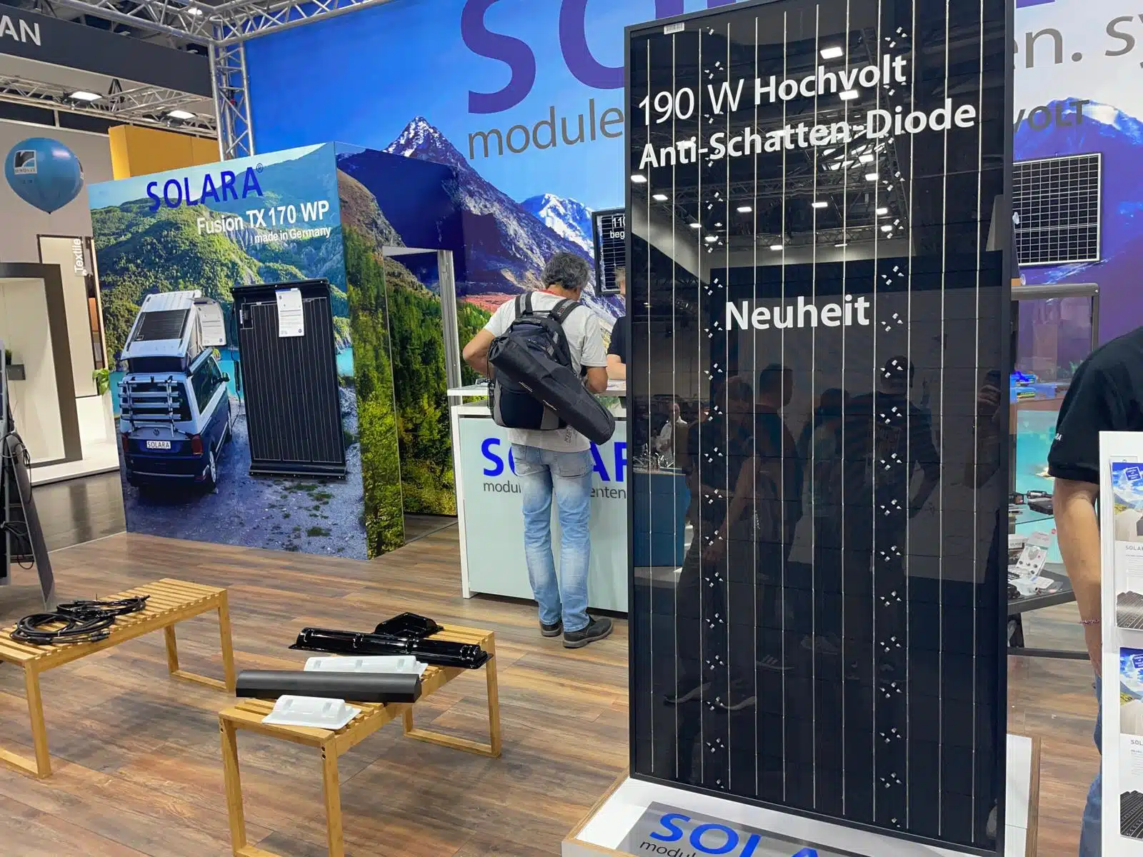 Mit der Power S-Serie HV deluxe präsentiert Solara in Düsseldorf Solarmodule mit sogenannter ASD-Technologie. Jede Solarzelle ist mit einer eigenen Diode ausgestattet, sodass auch bei Teilverschattung stets der bestmögliche Ladestrom anliegt. Die Hochvoltmodule arbeiten mit 72 lichtempfindlichen Mono-Perc-Zellen und erreichen Wirkungsgrade von über 22 Prozent. Dank gehärtetem 2-mm-TVG-Solarglas und spezieller Anti-Reflex-Beschichtung sind die Module leicht und bringen insbesondere an bewölkten Tagen bis zu fünf Prozent Mehrertrag. Ab September sind sie in den Leistungsklassen 190 und 120 Watt ab 849 Euro erhältlich. www.solara.de