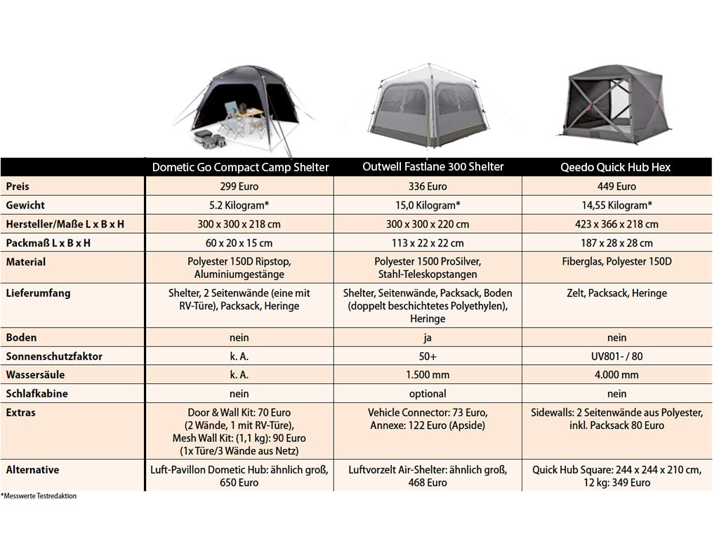 Dometic wie Outwell bieten eine Grundfläche von drei mal drei Metern. Der Qeedo Quick Hub Hex-Pavillon vervollständigt das Testfeld aufgrund zweier interessanter Attribute: Er soll unschlagbar schnell aufzustellen sein und ist mit 423 mal 366 Zentimeter noch etwas größer als die Kontrahenten. Lohnt der Griff zu einem etwas größeren Vorzelt? Auch auf diese Frage wird das Testteam eine Antwort liefern. Outwell und Dometic liegen mit 299, beziehungsweise 336 Euro preislich auf Augenhöhe, das Qeedo Quick Hub Hex mit 449 Euro eine Preisstufe darüber.