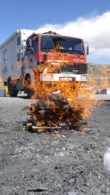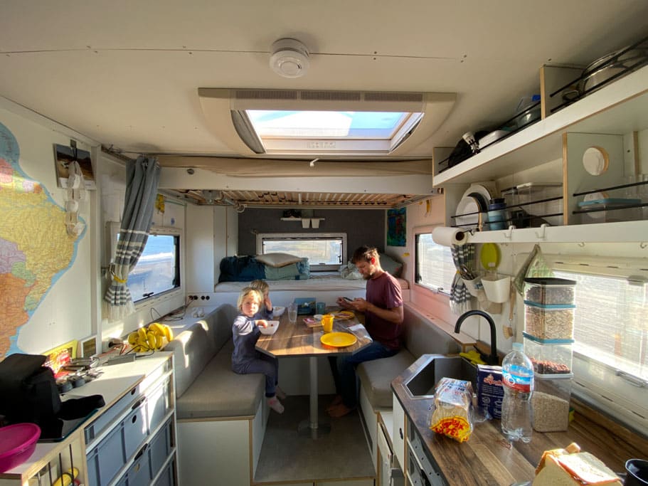 Also lasst uns über Amperstunden, Solar- und Wasserkapazitäten diskutieren: Wir haben 200-Ah-LiFePO4, 600 Watt Solar und 300 Liter Wasser an Bord – für eine vierköpfige Familie wohlgemerkt. Eine mögliche Versorgung über Landstrom besitzen wir nicht und unser verhältnismäßig kleiner Ladebooster schiebt im Fahrbetrieb nur maximal 20 Ampere Ladestrom in die Aufbaubatterie. „Das reicht euch in einem LKW ?“ Klare Antwort: ja. Unser Konzept beinhaltet allerdings noch einen Gastank, in dem energetisch ungefähr fünf Teslabatterien, also rund 500 kwh, gebunden in nur 50 Kilogramm schlummern. Damit machen wir Warmwasser, kochen und heizen – über Wochen. Diesel nutzen wir im Wohnraum nicht. Nach zwei Jahren Vollzeit im LKW sind wir von diesem Konzept immer noch begeistert und überzeugt.