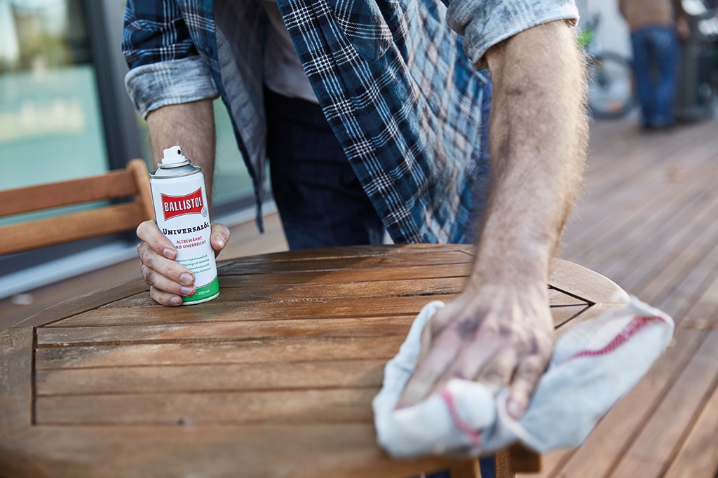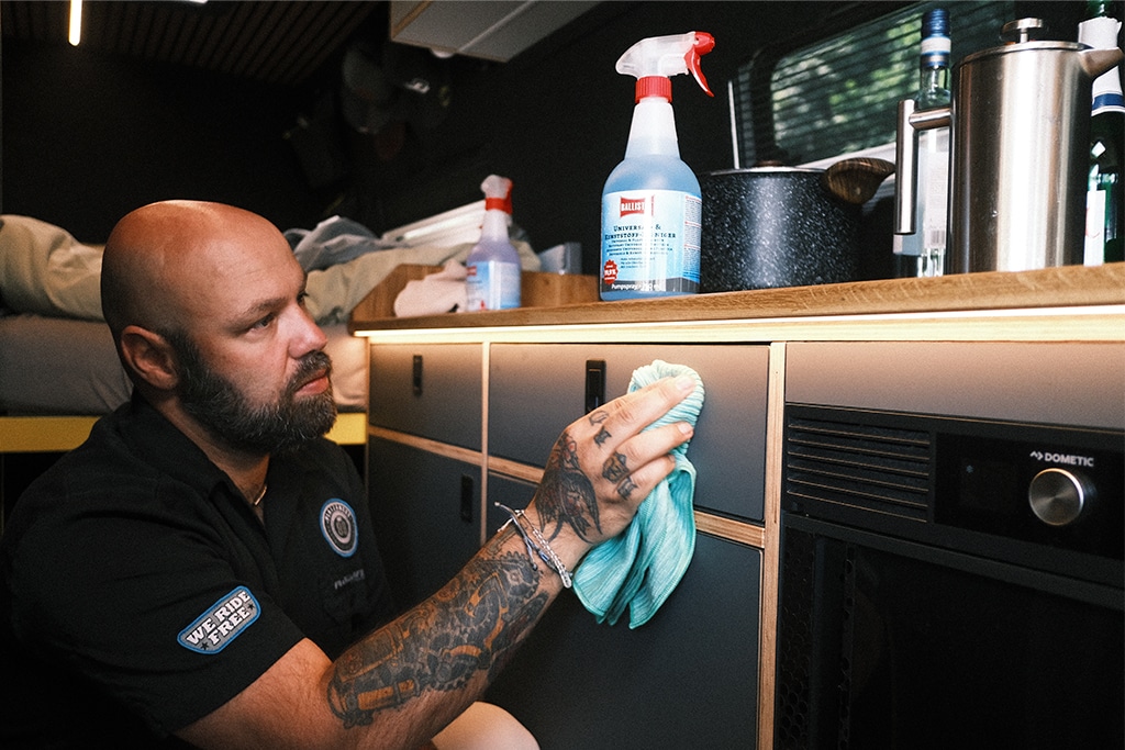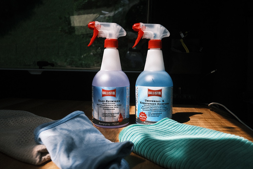 Für die Reinigung des Wohnmobils empfiehlt Ballistol den Universal- und Kunststoffreiniger. Mit seiner speziellen Formel entfernt er mühelos Schmutz, Flecken und Rückstände von Oberflächen, Campingmöbeln, Sitzpolstern und sogar Kleidung. Dank seiner schonenden Wirkung ist er auch für empfindliche Materialien bestens geeignet.