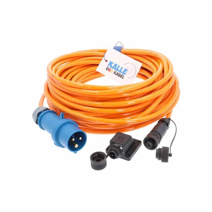 Es besteht aus einer 1,5 m langen CEE-Adapterleitung mit Schutzkontakt-Stecker und CEE-Kupplung, einem 3 m CEE-Verlängerungskabel mit Winkelkupplung und integrierter Schutzkontakt-Kombisteckdose – beide aus robuster H07RN-F 3G2,5-Gummileitung in auffälligem Orange.