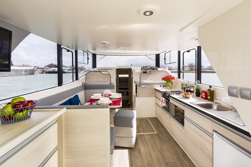 Die Hausboote gibt es mit 2-5 Kabinen. Alle bieten einen hellen, geräumigen Salon- und Küchenbereich mit 360° Panoramafenstern. Das Sonnendeck ist großzügig und mit Tisch, Grillplatte, Liegefläche zum Sonnenbaden und vielem mehr ausgestattet. Neueste Technologie (Bug- und Heckstrahlruder, Landstromanschluss, USB-Anschlüsse) macht den Urlaub entspannt und angenehm.
