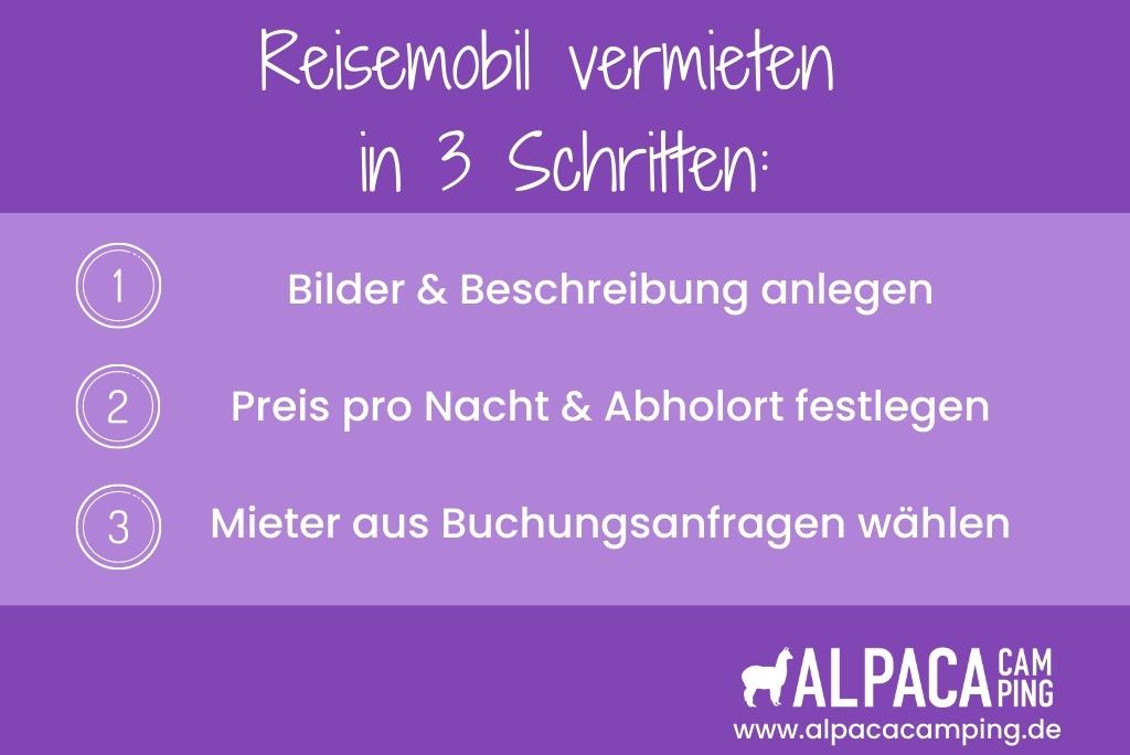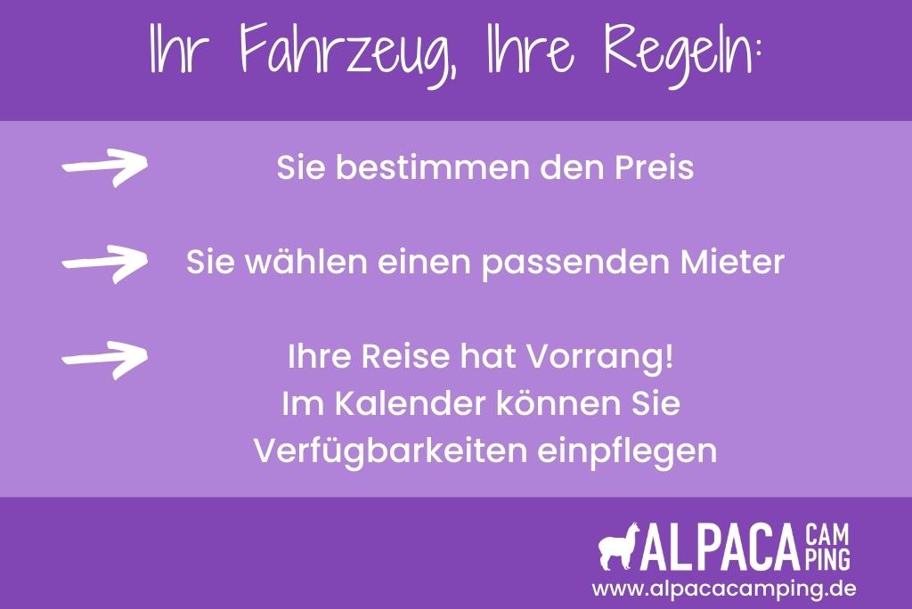 Auf alpacacamping.de kann jeder vermieten, der ein Wohnmobil oder einen Wohnwagen besitzt. Es gibt keine besonderen Anforderungen, die Ausstattung kann detailliert im Inserat angegeben werden. Unser Team unterstützt gerne beim Anlegen des Inserats. Eines ist uns besonders wichtig: das Zwischenmenschliche – Von Campern für Camper.