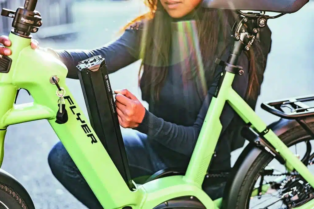 Auch viele eingebaute Akkus lassen sich entnehmen – hier sollte der Käufer darauf achten, dass der Akku von oben oder seitlich in den Rahmen eingesetzt wird. Von unten eingesetzte Akkus können beim Entnehmen leichter herabfallen und Schaden nehmen. Zudem sind Akkus an der Rahmenunterseite stärker Schmutz und Nässe ausgesetzt.