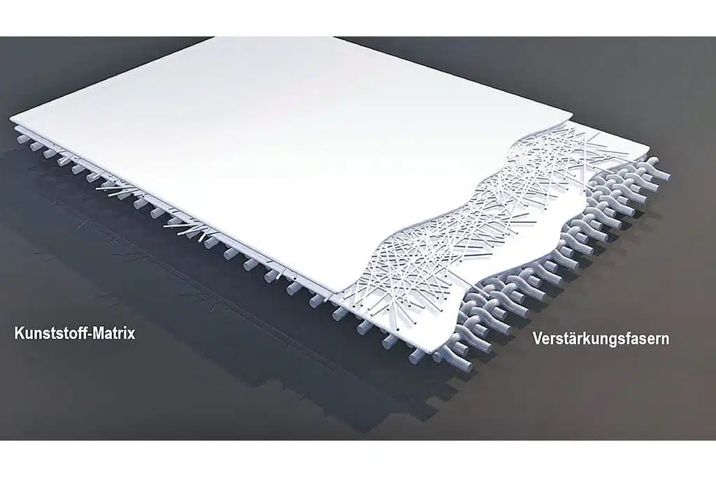 Glasfaserverstärkter Kunststoff (GfK) ist ein Verbundmaterial aus einer Kunststoffmatrix und Glasfasern und bietet eine Reihe vorteilhafter Eigenschaften: geringes Gewicht bei hoher mechanischer Festigkeit und Beständigkeit gegen Chemikalien, Korrosion sowie Witterungseinflüssen wie UV-Strahlung oder Hagel. Die in einem kontinuierlichen, großindustriellen Flachbahnverfahren produzierten faserverstärkten Kunststoffe ermöglichen als höchst stabile und gleichzeitig sehr leichte Konstruktionsmaterialien perspektivreiche Produktentwicklungen auch beim Caravan.