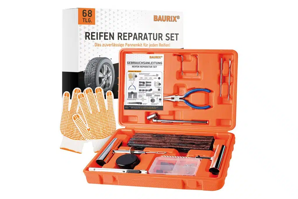 Um einen beschädigten Reifen zu reparieren, benötigt man ein Reparaturset. Das Set sollte zugelassen und mit allen benötigten Teilen ausgestattet sein.