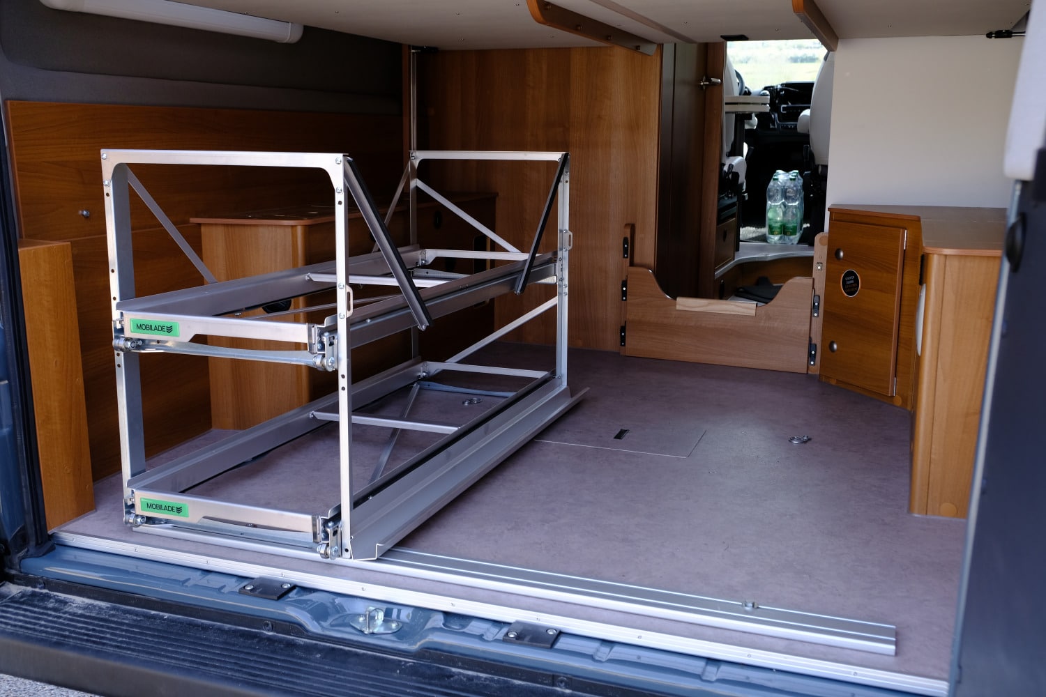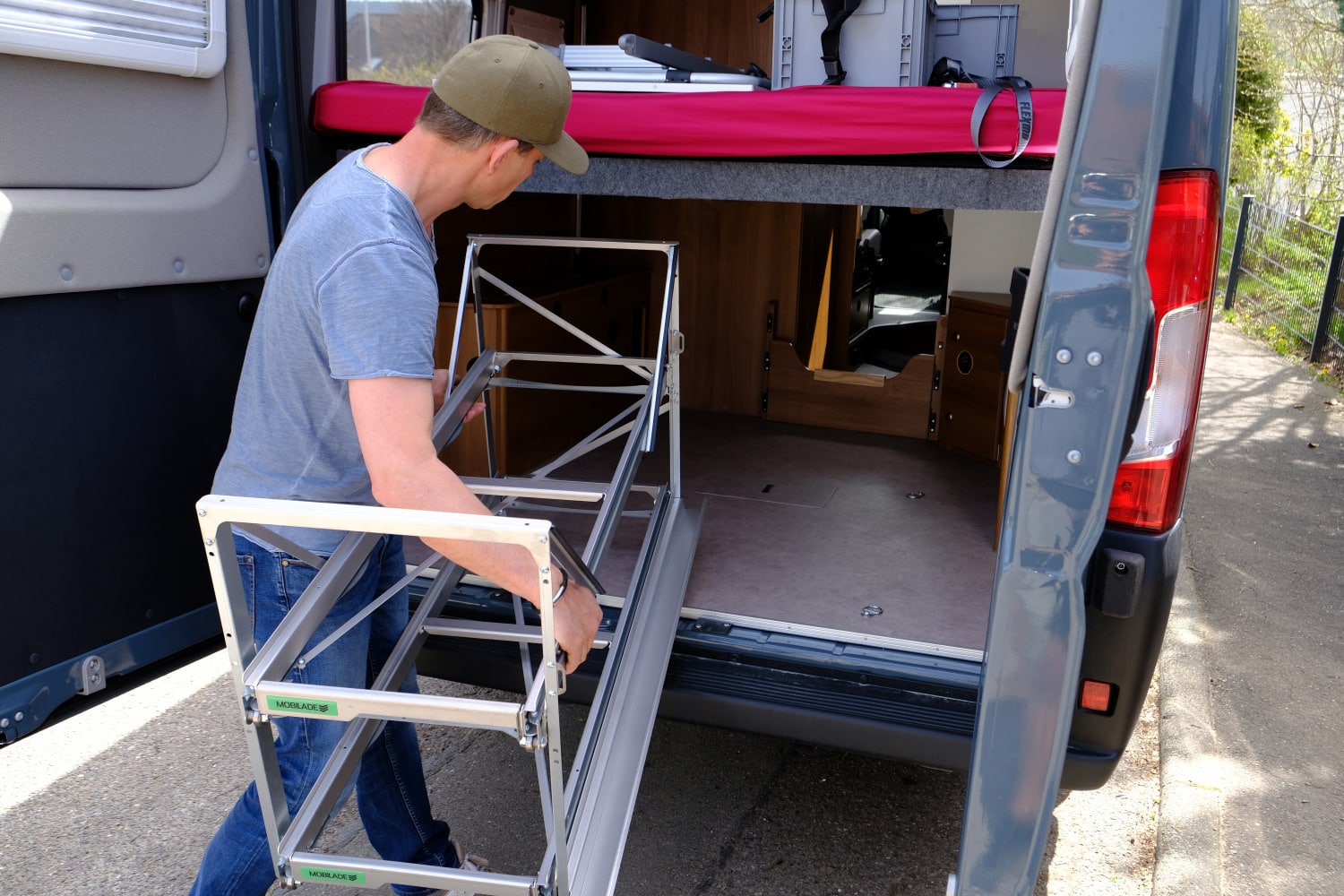 Beim flachen Boden und den Heckflügeltüren des Vantourers verzichten wir auf die Adapter. Der seitliche Tischhalter ist übrigens mit vier Schrauben blitzschnell montiert, ein Gurt sichert den Tisch – ist dieser lose, lässt sich der Tisch einfach herausziehen. Klasse Ergänzung aus unverwüstlichem Edelstahl für stattliche 119 Euro (passt für Duo und Trio 120). Die hier vorgestellte Mobilade Duo 120 (ohne Boxen) liegt preislich bei 959 Euro. Der Versand ist kostenfrei und – löblich – klimaneutral. Eine einfache, sozusagen einstöckige, 90 Zentimeter lange Mobilade startet preislich bei 377 Euro. Mono XL-Lade ist beispielsweise 215 Zentimeter lang und eignet sich für besonders breite Heckgaragen mit Türen auf beiden Seiten – auch bei (Teil-) Integrierten. Da sie zu beiden Seiten bis zu 60 Prozent ausziehbar ist, kommt man sogar bequem an die mittleren Boxen heran.