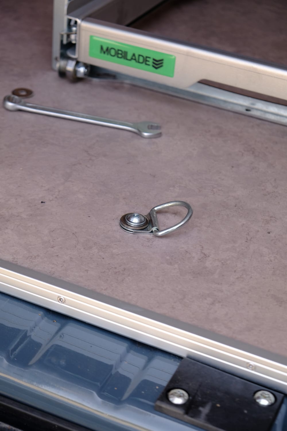 Die Mobilade wird in Lübeck aus einer hochfesten Aluminium-Legierung und Edelstahl hergestellt, mit rund 13 Kilogramm ist sie unschlagbar leicht, die Duo 120 (120 Zentimeter tief) lässt sich dennoch ganze 100 Zentimeter ausziehen. Bestückt wird sie mit gängigen Euro-Norm-Boxen, die es für kleines Geld in jedem Baumarkt gibt. Diese rutschen mit ihrem Sockelprofil exakt in die Mobilade hinein, sitzen bombenfest.