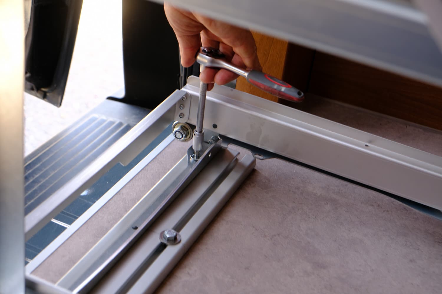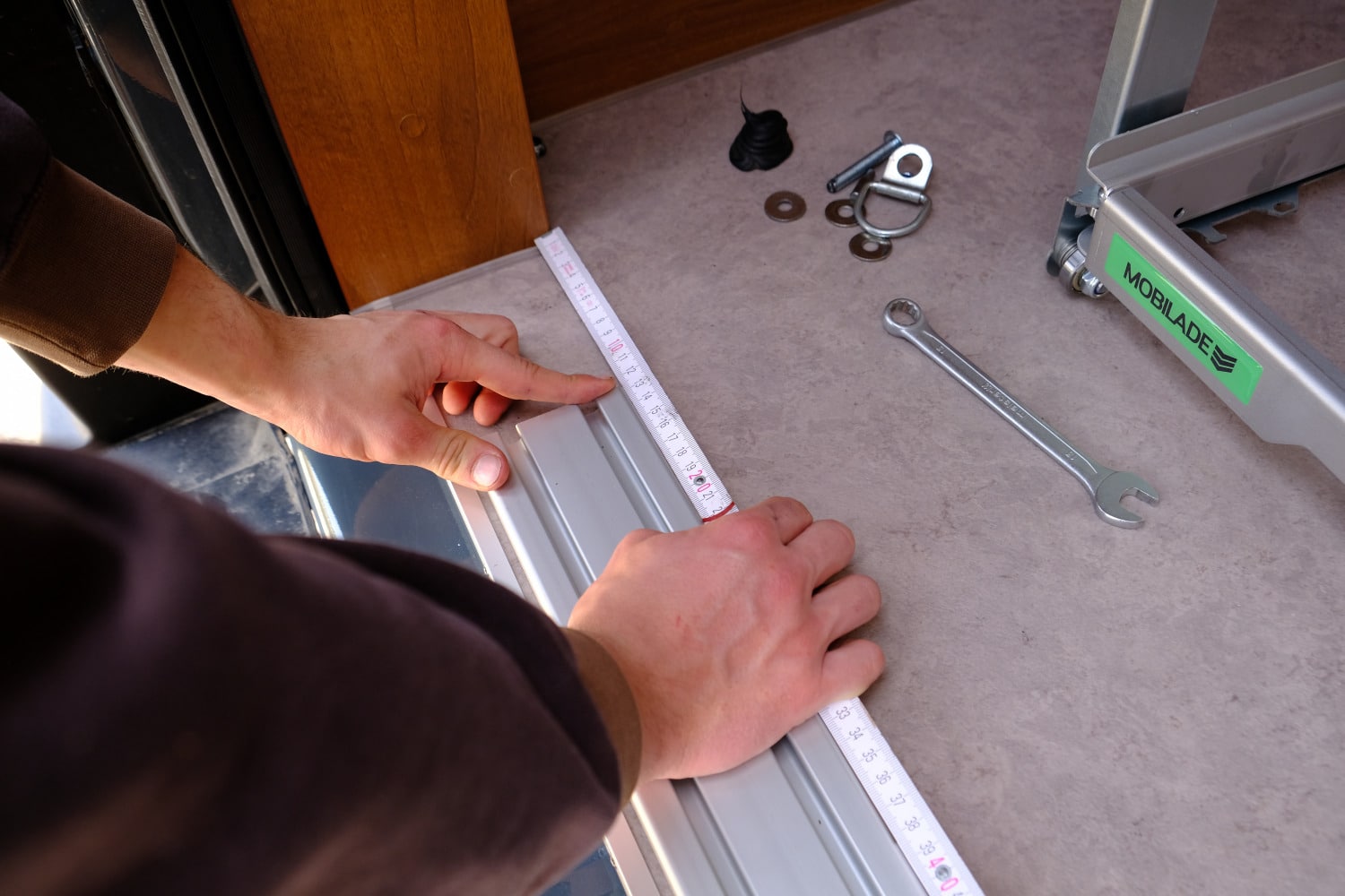 Da der Vantourer vier Zurrösen im Boden bietet, entscheiden wir uns für ein flaches Nutprofil als Basis für die Mobilade und die Gabelhalter für die Bikes. So brauchen wir keine Löcher im Boden zu bohren, das gewählte Zubehör (Schubladen, Radhalter) kann jederzeit umplatziert oder etwas verschoben werden. Das lichte Maß zwischen den Heckschränken im Vantourer misst etwa 120 Zentimeter, zwei aufs exakte Maß geschnittene Profile bestellen wir im Internet für 36 Euro, die passenden M8er-Nutsteine gibt’s dort ebenso für kleines Geld. Wer auf ovale Nutsteine (siehe Detailbild) setzt, muss diese nicht von einer Schienenseite einschieben, sondern kann diese an jedem beliebigen Ort der Schiene „einklippen“. Ein großer Vorteil, wenn man schon anderes Zubehör verschraubt hat, was man sonst lösen müsste.