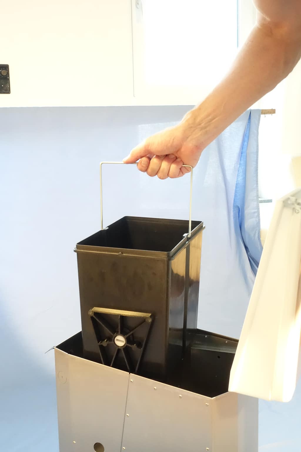 Feststoffe dagegen werden separat – aber ebenfalls von außen – durch eine Serviceklappe entnommen. Darin befindet sich ein Eimer auf einem ausfahrbaren Schlitten.