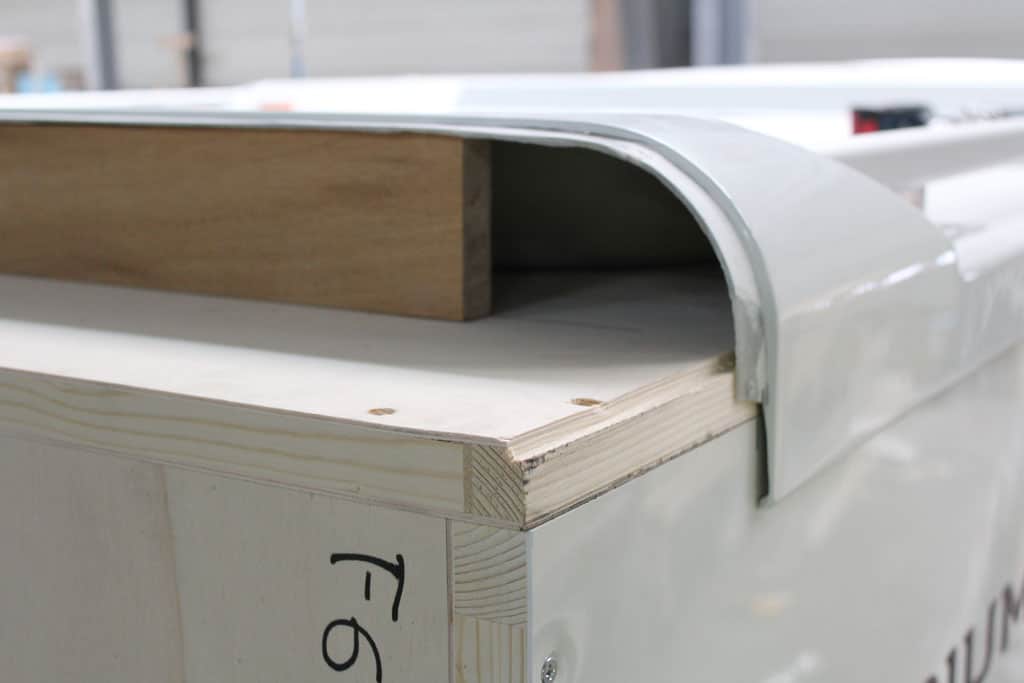 Beispiel Carthago: Hier wird für die Boden- Wand-Verbindung ein innen liegender Tragholm verwendet, entlang dessen die Verklebung erfolgt. Das soll auch zusätzliche Stabilität bieten. Anders die Verbindung von der Seitenwand zum Dach: Hier wird die Wand zum Dach hin gebogen und verklebt. Ein Profil deckt die Nahtstelle ab. Für die Rundung wird der XPS-Schaum im Inneren der Wand eingeschlitzt.