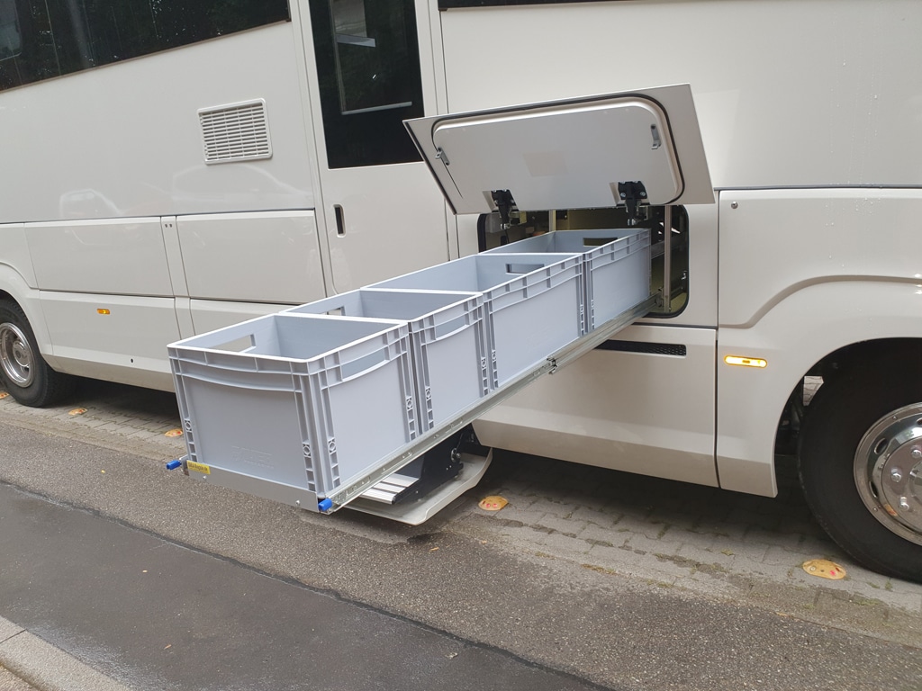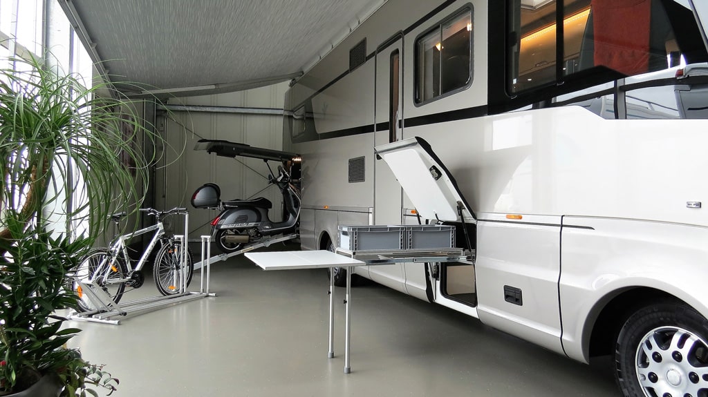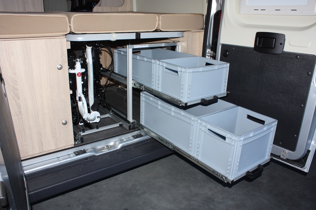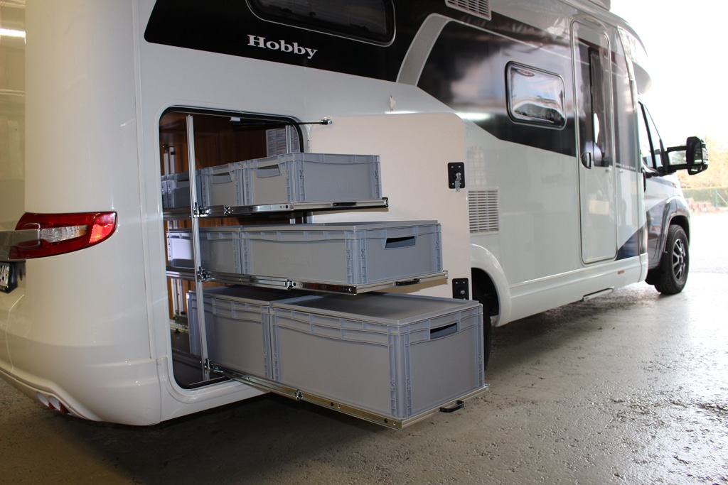 Bei einem neu erworbenen Wohnmobil steht der Kunde in der Regel vor einer großen, leeren und unmöblierten Heckgarage. Viel Raum, der in diesem Zustand kaum effektiv zu nutzen ist. Wer hier einfach hineinstappelt, muss stets die halbe Garage leerräumen, wenn irgend ein wichtiges Zubehör mal eben benötigt wird. Nicht viel besser sieht es hinter Stauklappen, im Zwischenboden und/oder den Küchenschränken aus. Fehlen hier Auszüge, muss der Camper häufig tief in die Knie gehen, um in der letzten Ecke des Fachs, hinter den Nudelpackungen, die dort vermutete Müslipackung zu finden. Kurzum: das nervt. Zeit für eine Optimierung – beginnen wir mir der Heckgarage: