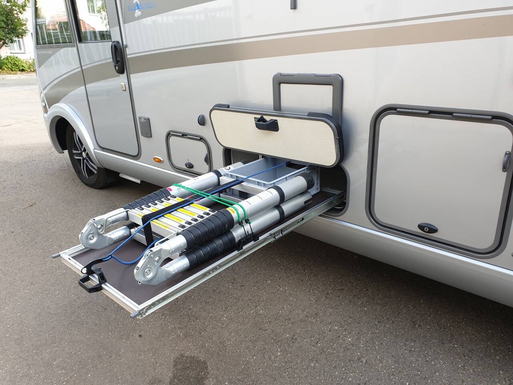 Und wohin mit dem ganzen Krimskrams wie dem Zubehör für die Ver- und Entsorgung, die WC-Zusätze, die Kabeltrommel, Wasserschlauch samt aller Adapter, Fahrradhelme und Werkzeug? Hierfür bieten sich wunderbar individuell gestaltbare Regal- und Auszugssysteme an. Diese Nachrüstlösungen werden bei fast allen Anbietern individuell und millimetergenau an das jeweilige Fahrzeug und die an die jeweiligen Bedürfnisse angepasst. Reisemobil International hat eine Auswahl an Regalbauern zusammengestellt.