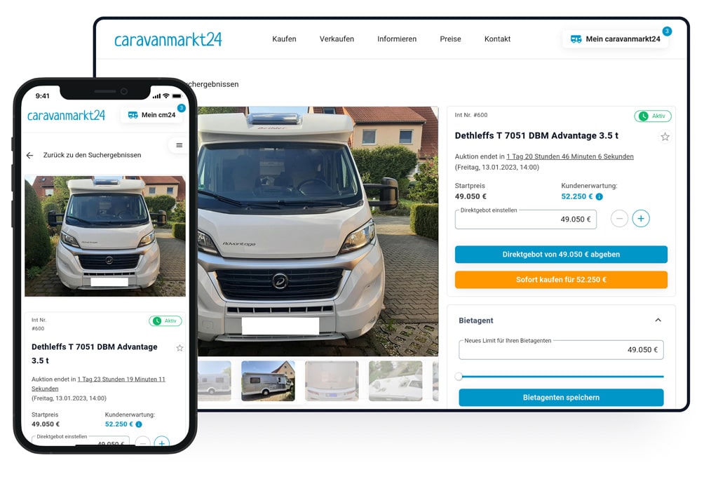 Bereits über 2.000 Online-Auktionen hat man bei caravanmarkt24 durchgeführt, mehr als 220 Fachhändler aus der Branche bieten täglich auf Wohnmobile in der Auktion