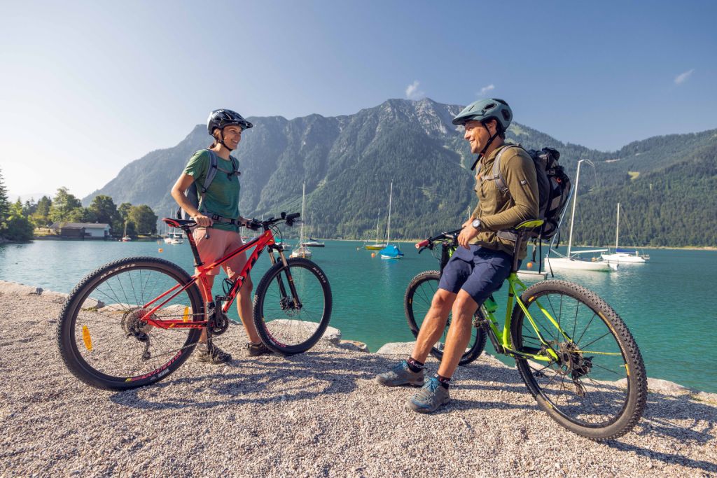 Bergauf, bergab und am See entlang: Die Region Achensee bietet optimale Bedingungen für Radfahrer, E-Biker und Mountainbiker. 250 Kilometer Routen aller Schwierigkeitsgrade führen durch imposante Landschaften. Besonders geeignet für Familien und Kinder sind die flachen Radwege am Ufer des Achensees. Ein Eis bei einem Kiosk als Belohnung ist dabei garantiert. Weite Ausblicke auf die Gipfelwelt und sportliche Abfahrten in die Täler: Auch Mountainbiker kommen am Achensee bei tollen Touren auf ihre Kosten.
