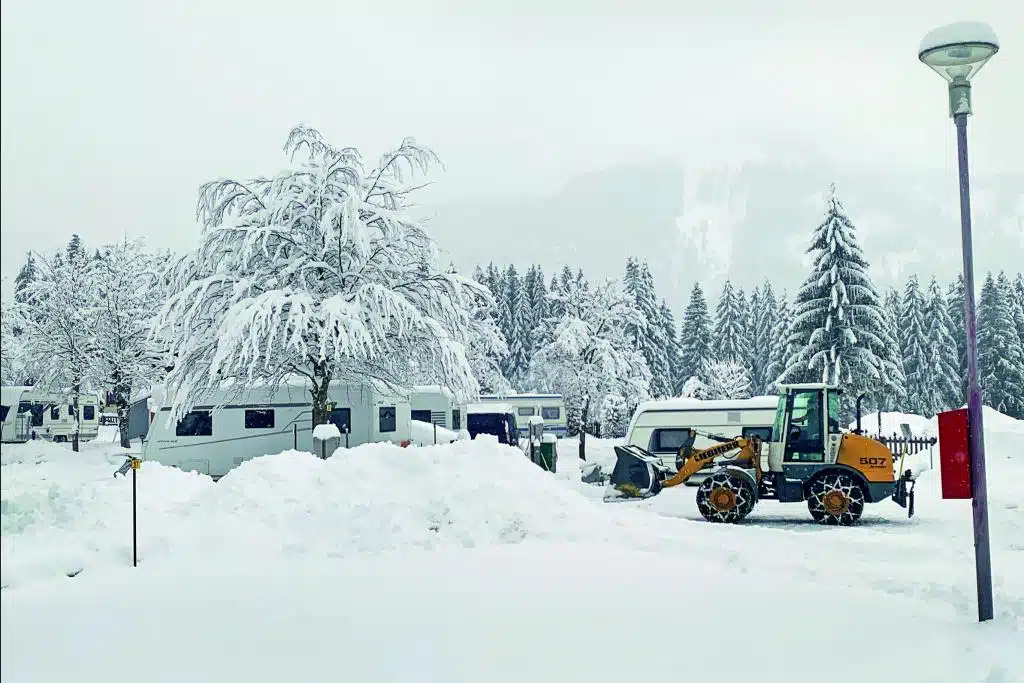 Auf einer Höhe von 1.150 Metern ist die Schneesicherheit recht groß, jedoch nicht garantiert. Wir erleben nach vielen Tagen des Tauwetters den ersten Neuschnee, der einen bezaubernden Mantel über die Landschaft und den Platz legt – aber auch bitter nötig war. Der Räumtrupp ist mit dem Schaufelradbagger voll im Einsatz und beugt den Schneemassen vor, damit die Parzellen auch bei weiterem Schneefall gut erreichbar bleiben. So überzeugt der Platz mit großzügigen Stellplätzen bis 100 Quadratmeter auch im Winter, die mit Strom-, Wasser- und Fernsehanschluss ausgestattet sind. 60 Parzellen verfügen sogar über eine eigene Gasversorgung, was gerade beim Saisoncamping sehr komfortabel sein kann.