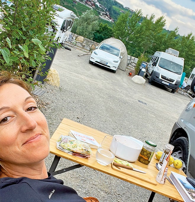 Blick auf die Weinberge: Gemütliches Picknick am Abend auf dem Stellplatz Hotel Löwentor in Brixen.
