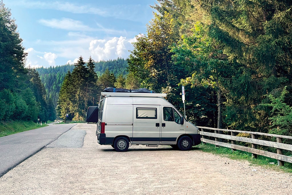 Ausgangspunkt: Der Waldparkplatz bietet auch größeren Reisemobilen gut Platz – wie der Abstand zur Straße zeigt.