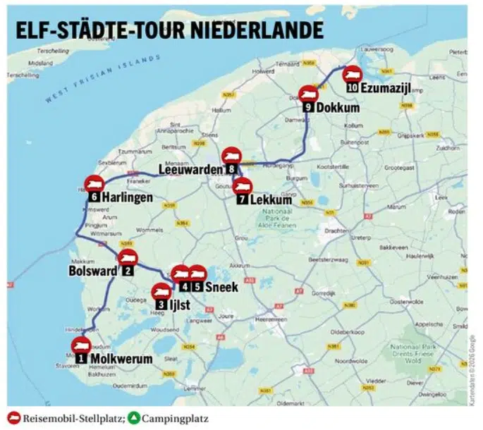 Zählen wir sie einmal auf, die Elf Städte, in der von uns für die Fahrt gewählten Reihenfolge: Stavoren, Hindeloopen, Workum, Sneek, Iljst, Bolsward, Franeker, Harlingen, Leeuwarden, Dokkum, Sloten. Stellplätze für Reisemobilisten finden sich genügend entlang der Route, wenn auch nicht in jeder Stadt und nicht in jedem Fall ganzjährig geöffnet. Auch den Begriff Stadt muss man etwas relativieren. Die meisten der elf Städte haben eher dörflichen Charakter. Von der Provinzhauptstadt Leeuwarden mit knapp 100.000 Einwohnern abgesehen, handelt es sich um kleine Orte mit wenigen Tausend Einwohnern. Sloten gilt sogar als kleinste Stadt der Niederlande, hier leben nur etwa 740 Menschen. Die Verleihung der Stadtrechte geht weit zurück bis ins Mittelalter.