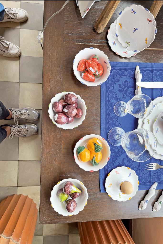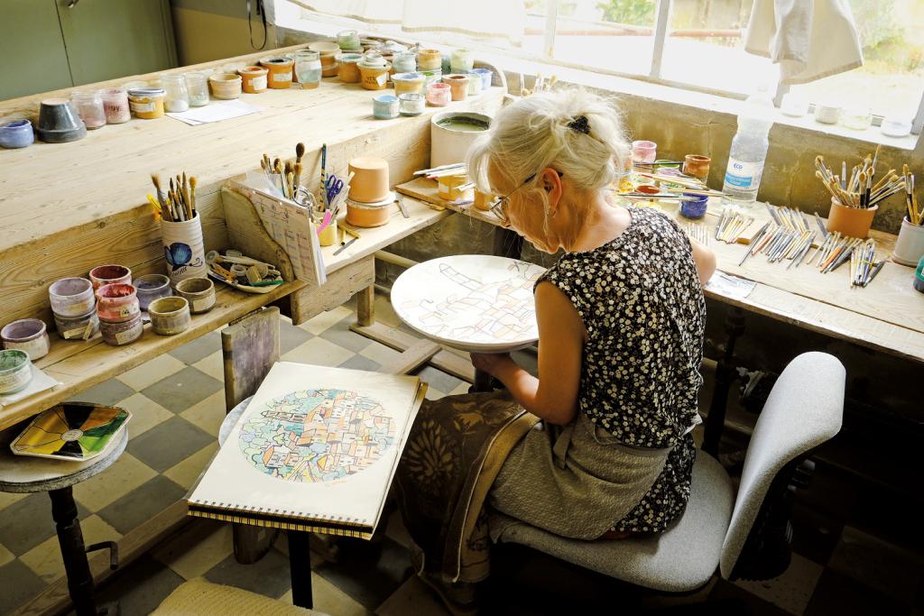 Noch immer werden alle Stücke handgefertigt. Im Schaufenster liegen glänzend glasierte Erdbeeren, Mandarinen und Feigen in verzierten Tonschalen. Die Keramikfrüchte sind ein echter Verkaufsschlager. Töpferei und Werkstatt befinden sich in den hinteren Räumen des Geschäfts. Fasziniert bleiben die Besucher am Arbeitstisch der Porzellanmalerin stehen. Mit sicherem Pinselstrich überträgt sie das bunte Motiv der neben ihr liegenden Zeichnung auf einen Teller. Stille kehrt ein – und so mancher hält den Atem an –, als könnte mit einer hektischen Bewegung der Pinsel verrutschen.