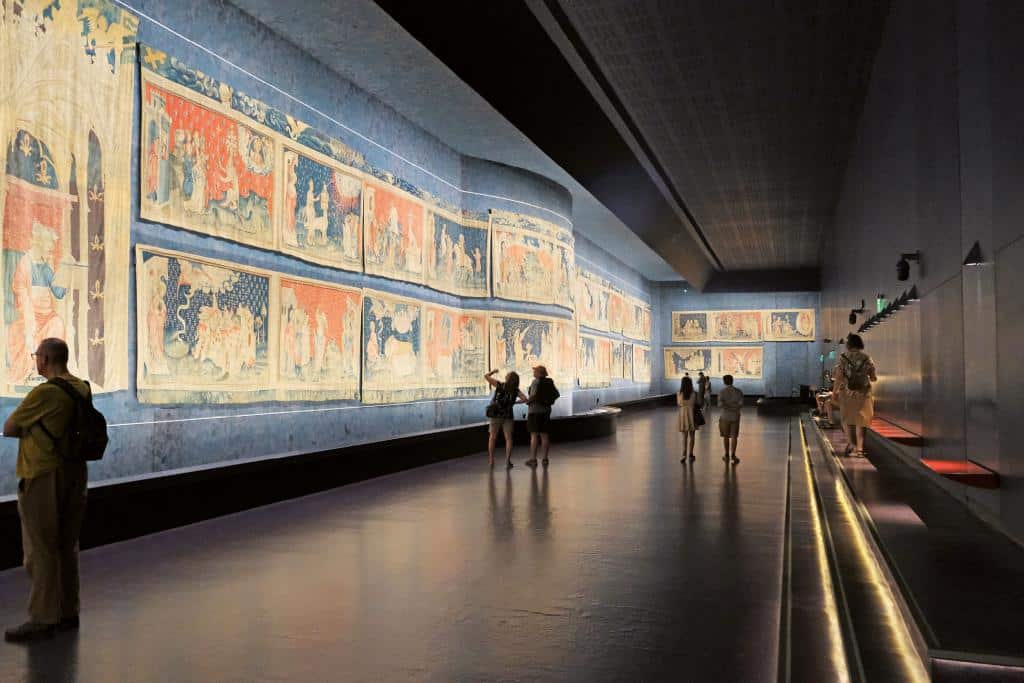 Aber auch von Schutz: Hinter den dicken Mauern verbirgt sich der 103 Meter lange Wandteppich der Apokalypse vor Sonnenlicht und Mondschein – beides würde den rein aus Wolle gewebten Teppich beschädigen. Im Jahr 1375 hat ihn Herzog Ludwig I. von Anjou in Auftrag gegeben, sieben Jahre später wurde der Wandteppich fertiggestellt und 2023 in das UNESCO-Register „Memory of the World“ aufgenommen. Er zeigt über ein sechsteiliges Ensemble die Apokalypse oder Offenbarung des Johannes, das letzte Buch des Neuen Testaments: ein Kampf zwischen Gut und Böse.