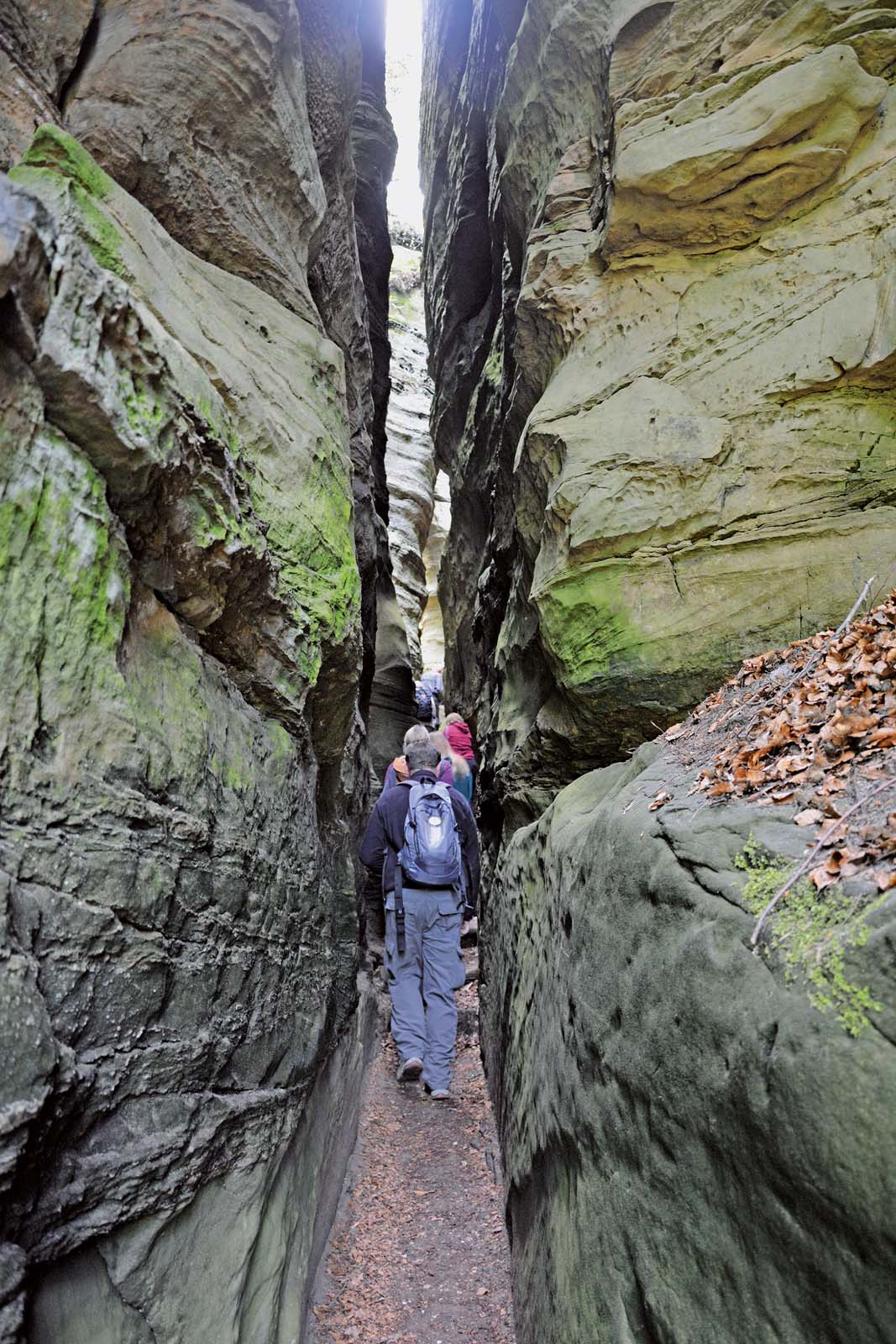 Ziel der Sechs-Kilometer-Tour ist die kleine Gemeinde Berdorf. Der gut begehbare Pfad steigt sogleich steil an, gewinnt Meter um Meter an Höhe. Nach wenigen Minuten bietet sich ein herrlicher Blick auf Echternach. Die Berge im Hintergrund jenseits der Sauer gehören noch zu Deutschland. Die Strecke nach Berdorf ist Teil der Route 2 des Mullerthal-Trail. Wer übrigens meint, die ganze 37 Kilometer lange Route 2 oder die ebenso langen Routen 1 und 3 an einem Stück erwandern zu können, den belehrt die anspruchsvolle, aber ungeheuer schöne Landschaft schnell eines Besseren. Für die sechs Kilometer des gewählten Abschnitts benötigt ein durchschnittlich wanderbegabter Urlauber, Redakteur oder Tank-Tourist bestimmt drei Stunden.