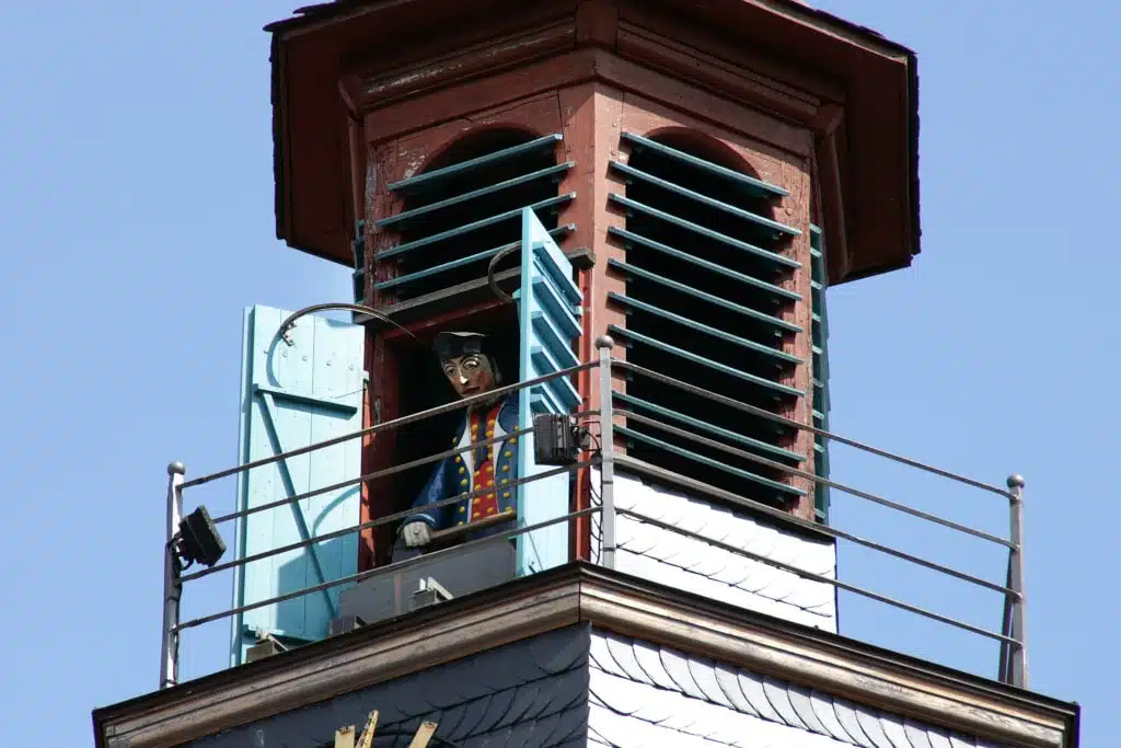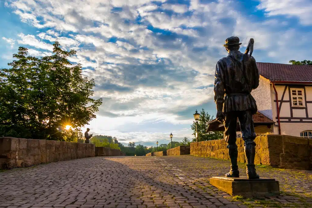 Tatsächlich ist Melsungen über die B 253 schon nach fünf Kilometern erreicht, und der Campingplatz an der Fulda lockt mit Nähe zur malerischen Fachwerkstadt. Zu Fuß sind es drei Kilometer bis zum historischen Rathaus, das einen Besuch unbedingt lohnt. Es wurde 1562 bis 1568 erbaut, nachdem es ein Großbrand zuvor zerstört hatte. Heute gilt es als eines der schönsten Fachwerk-Rathäuser Deutschlands – es steht nach allen Seiten frei und beherrscht den Melsunger Marktplatz. Schon 1928 wurden das alte Fachwerk und der bis dahin verschüttete Ratskeller wieder freigelegt. In dem Rathaus befindet sich die Stadtverwaltung. Der Mittelturm krönt das Gebäude und hier zeigt sich täglich um 12 und 18 Uhr die einzigartige Figur des Melsunger Wahrzeichens: der Bartenwetzer.