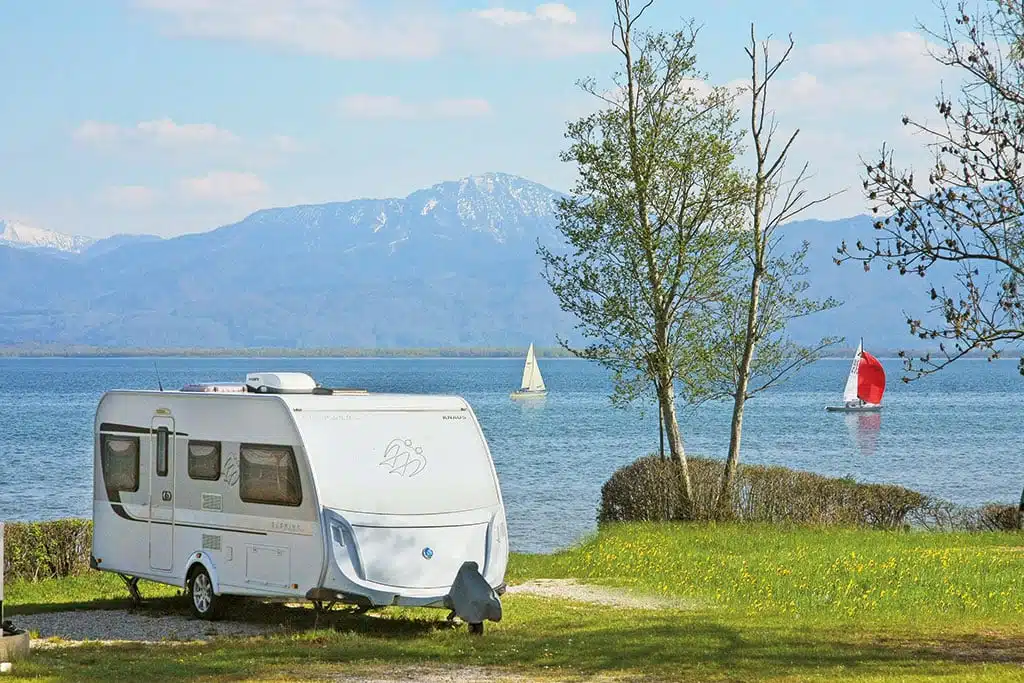 Camping Seehäusl, Beim Seehäusl 1, 83339 Chieming-Stöttham, Tel.: 08664/303, info@camping- seehaeusl.de, www.camping-seehaeusl.de. Direkt am Chiemsee gelegen. Liegewiese. 44 Stellplätze für Touristen. Restaurant mit See-Terrasse. SUP-Verleih in der Nähe. Kinder-Sandstrand. Natur-Kneipp-Becken, Boccia-Bahn. Brötchenservice. Stellplatz für zwei Personen und ein Kind (12 Jahre) in der Vor-/ Nachsaison: 47 Euro zzgl. Kurtaxe. Geöffnet: 1.4. bis 30.9.