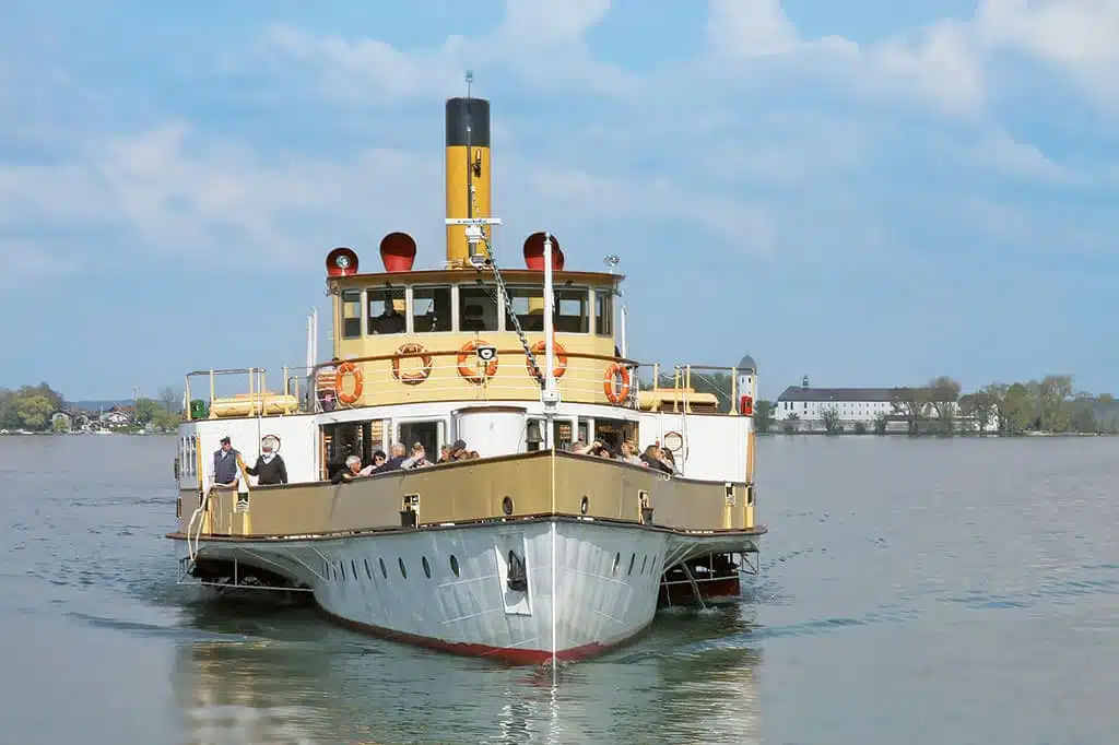 Zwischen dem Campingplatz in Lambach und Ludwigs Prunk-Schloss Herrenchiemsee auf der Herreninsel liegen Luftlinie rund zehn Kilometer. Definitiv zu weit für die Tretboote und Stehpaddelbretter, die man auf dem Campingplatz mieten kann. Ein empfehlenswerter Weg führt über die Radroute des Chiemsee-Uferwegs, auf dem auch die Klosterweg-Radtour verläuft. Nah am See, ohne große Steigungen, geht es nach Gstadt. Von dort aus fährt die Flotte der Chiemsee-Schifffahrt die Inseln sowie verschiedene Häfen rund um den See an.